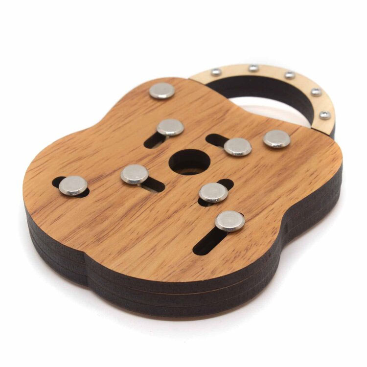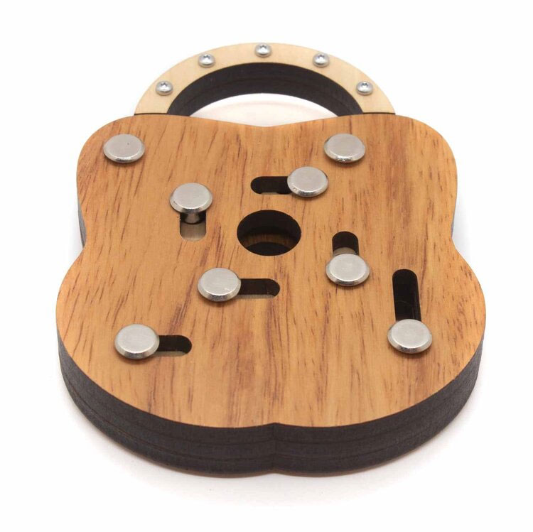 Das JP Lock ist ein Trickschloss aus Holz. Aufgabe ist es, das Schloss zu öffnen. Dazu muss man die Metallstifte in eine bestimmte Kombination bringen, damit der Weg frei wird.