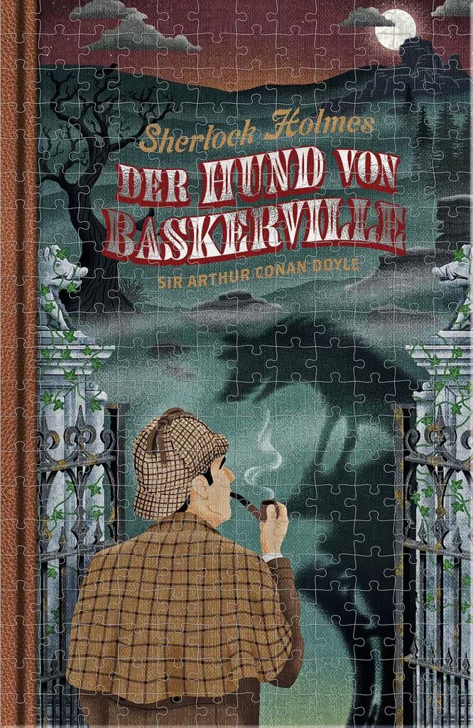 Die Vorderseite dieses Puzzles wird von wunderschönen Illustrationen passend zum Literaturklassiker Sherlock Holmes Der Hund von Baskerville von Sir Arthur Conan Doyle geschmückt. Die Zeichnung zeigt den Meisterdetektiv Sherlock Holmes mit seiner Pfeife vor dem unheimlichen Schauplatz der Geschichte, den vernebelten Mooren von Devonshire rund um Baskerville Hall, samt Schatten des mysteriösen Hundes. Auf der Rückseite des Puzzles ist eine Seite aus dem Buch über die gespenstische Detektivgeschichte abgebildet. So lässt sich das Puzzle beidseitig spielen und schafft doppelten Puzzlespaß. Auf der besonderen Verpackung in Buchform finden sich neben dem beeindruckenden Motiv der Puzzlevorderseite auch passende Symbole auf dem Buchrücken. So wird das Bücher-Puzzle zum perfekten Hingucker im Bücherregal und eignet sich auch ideal als Mitbringsel für Leseratten, Sherlock-Fans und Freund*innen von schönem Zeitvertreib.