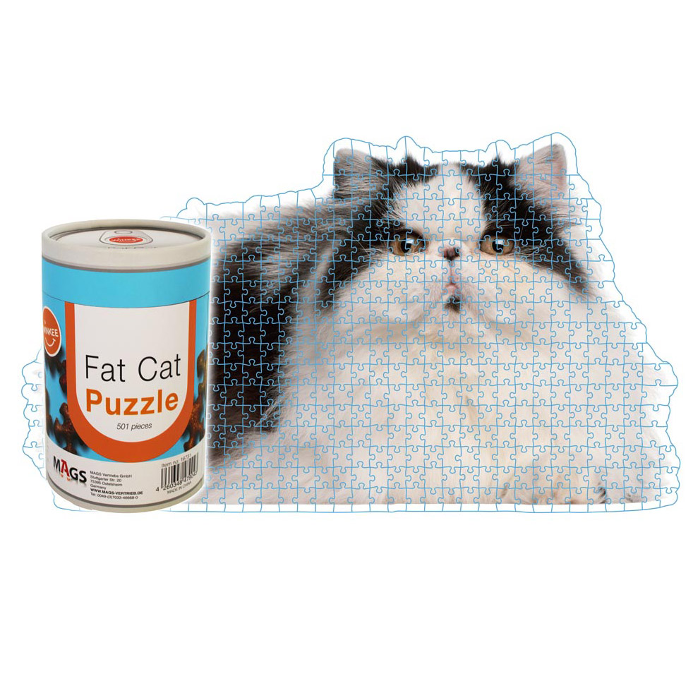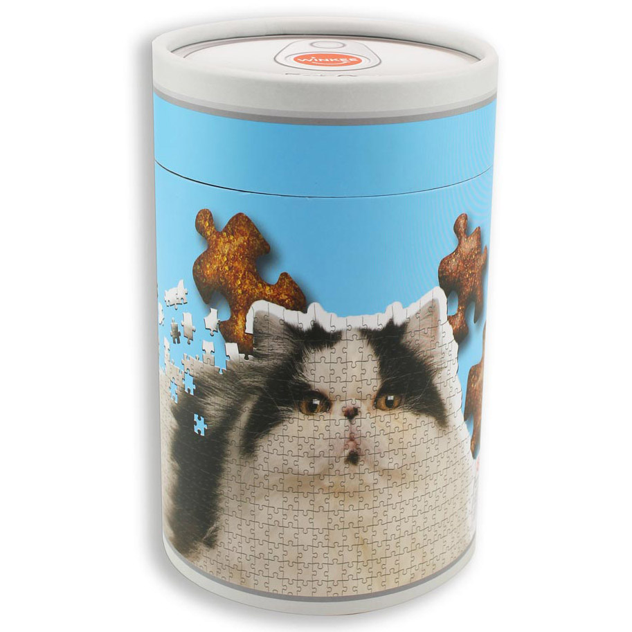 Das Puzzle Dicke Katze wird in einer passenden Katzenfutter-Dose (aus Pappe) geliefert. Das Puzzle besteht aus 501 Teilen.