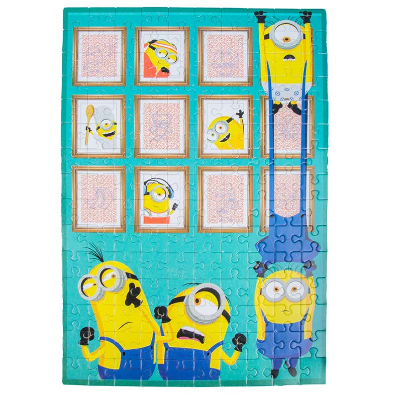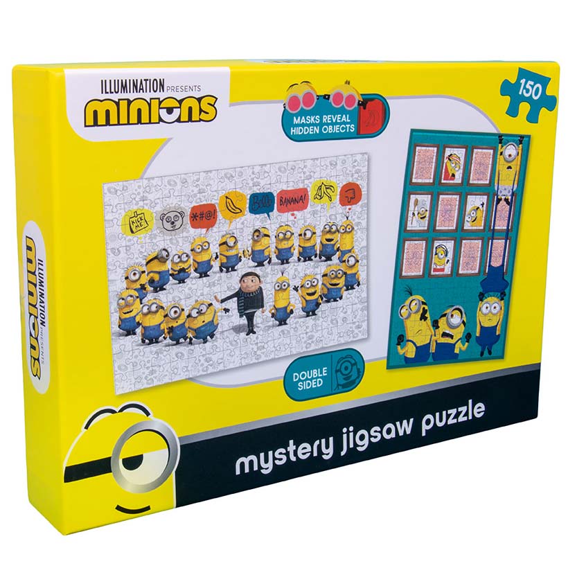 Das doppelseitige Minions Puzzle besteht aus 150 Teilen. Es hat zwei verschiedene Motive auf Vorder- und Rückseite.