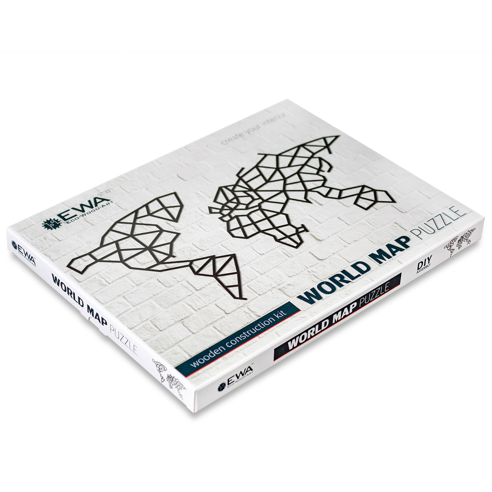 Eine Weltkarte als Wandpuzzle: Die Wandpuzzle von Eco Wood Art sind aus Holzteilen gefertigt, die Sie mit Hilfe einer Schablone zusammensetzen können. Ein stylisches Design aus einem polygonen Puzzle für Ihre Wand!