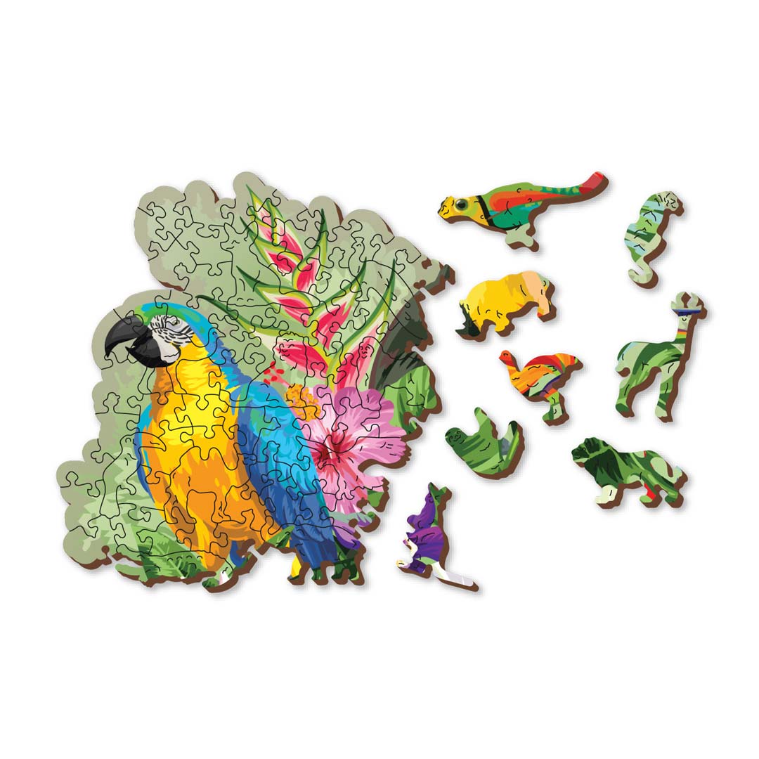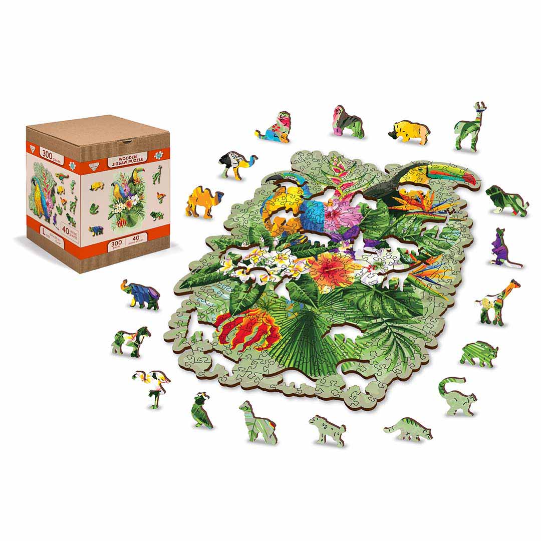 Das Wooden Puzzle "Tropical Birds" in der Größe L mit 300 Teilen. Größe des Puzzles: 37,5 x 25,4 cm