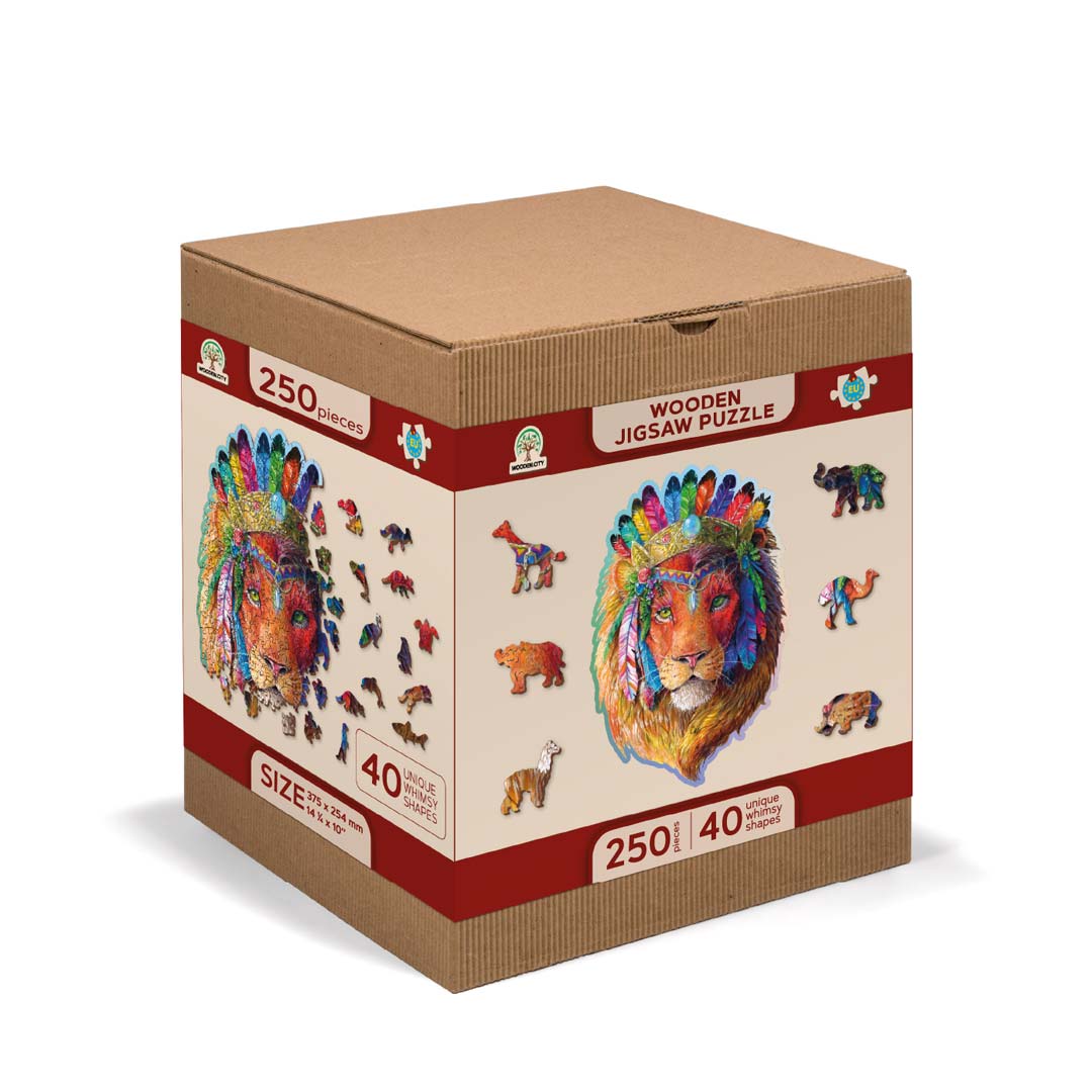 Das Wooden Puzzle "Mystic Lion" in der Größe L mit 250 Teilen. Größe des Puzzles: 37,5 x 25,4 cm