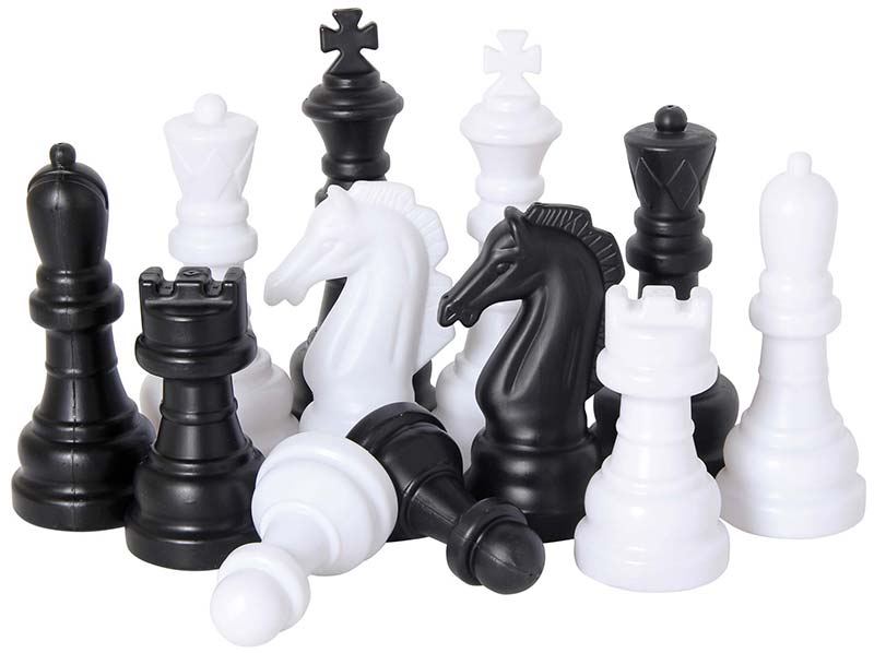 Inklusive faltbarer Spielfläche 158 x 158 cm und vier Heringen zur einfachen Fixierung. Extra große Schachfiguren (Königshöhe 27 cm) in klassischem Schwarz/Weiß Design aus hochwertigem Polyethylen. Kompakt verstaut in wetterfester Klarsicht-Tragetasche.