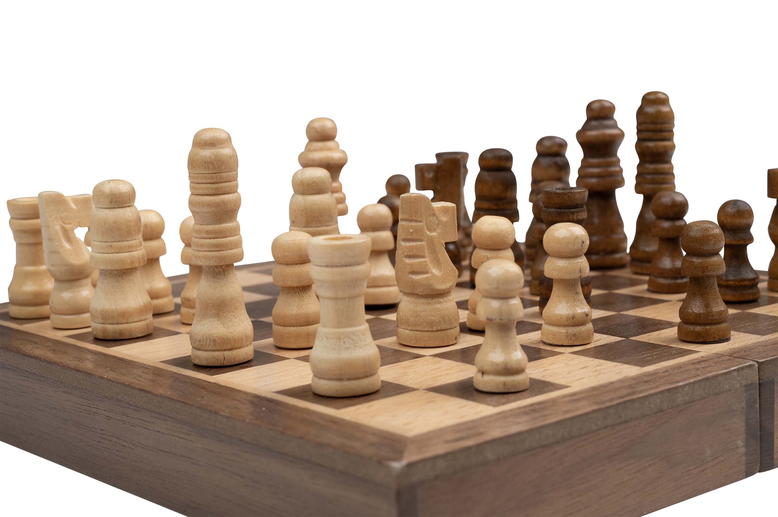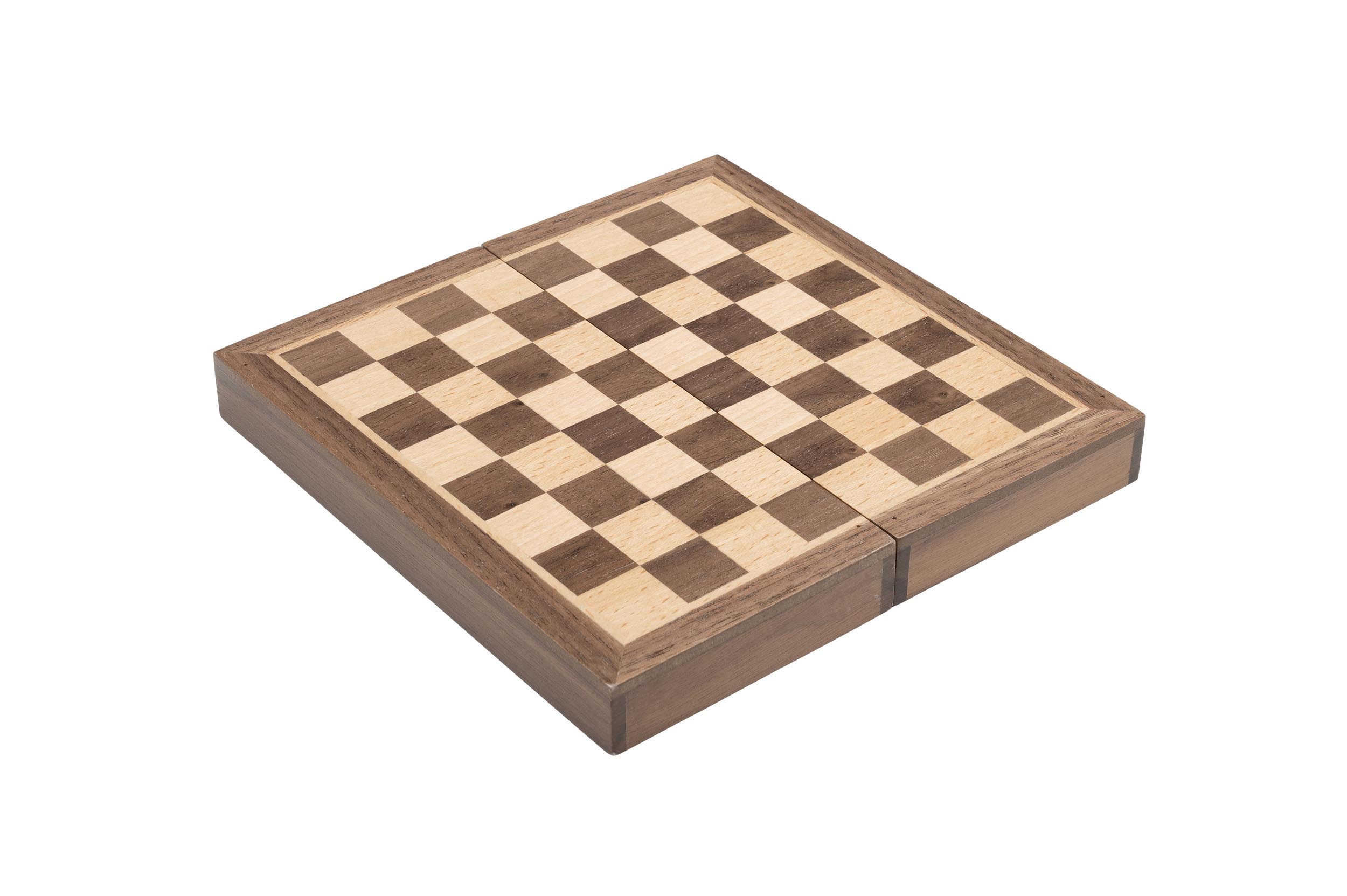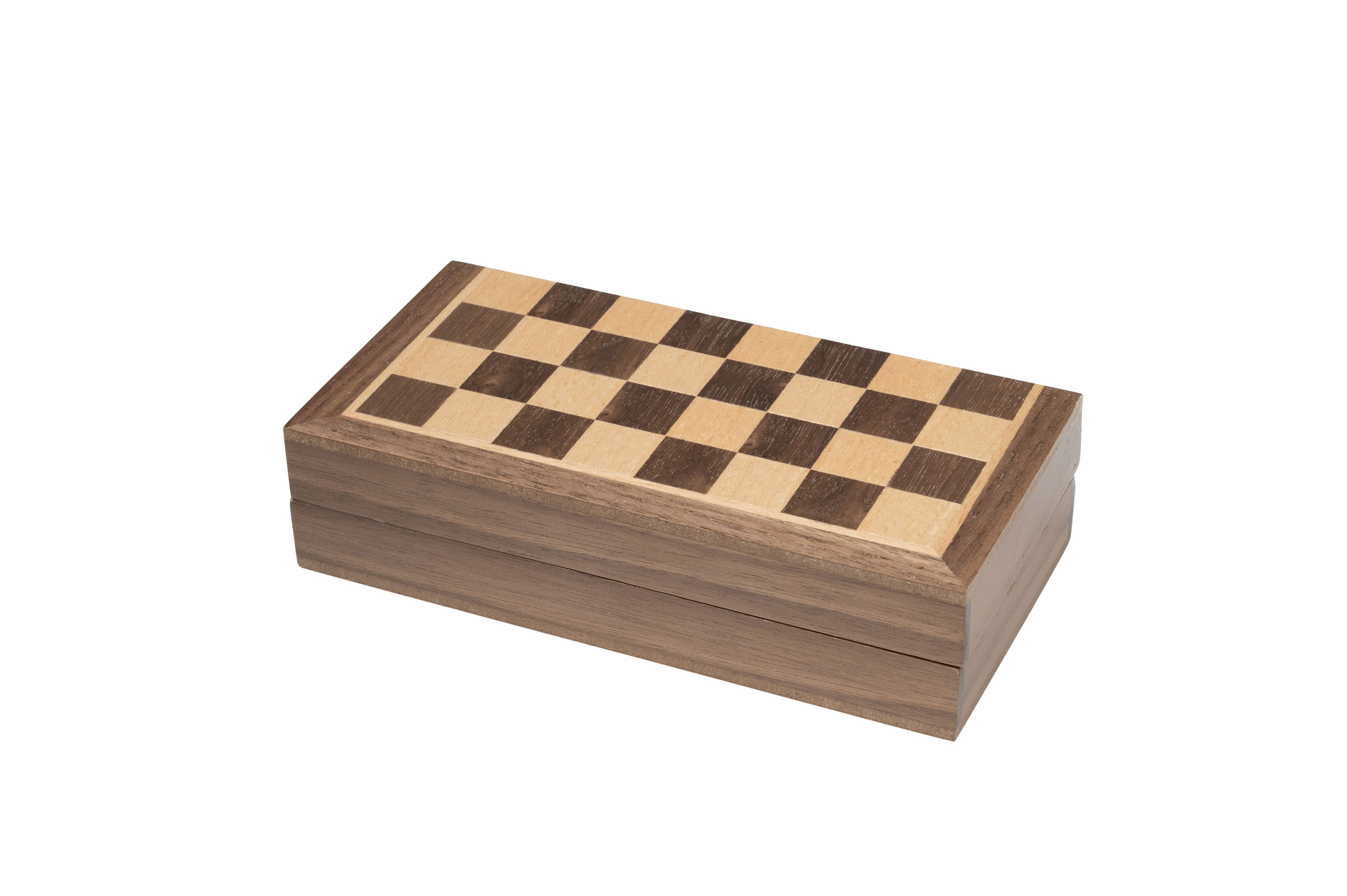 Schachkassette auch prima als Reise-Schach verwendbar. Kassette: MDF, Walnuss, Buche Furnier, Walnuss Furnier, Zierader, Intarsien, magnetisch, Magnetverschluss, Figureneinlage. Feld 16 mm. Figuren: Design Staunton, Schima Holz, natur und braun gebeizt, Filzsockel, magnetisch, König 39 mm. Maße offen: 150 x 150 x 19 mm.