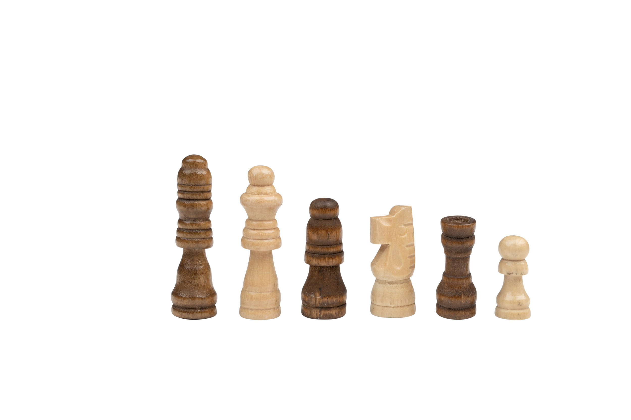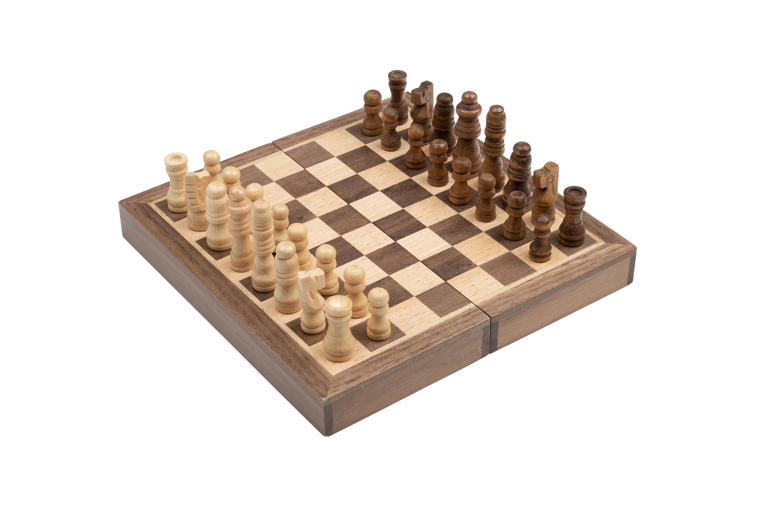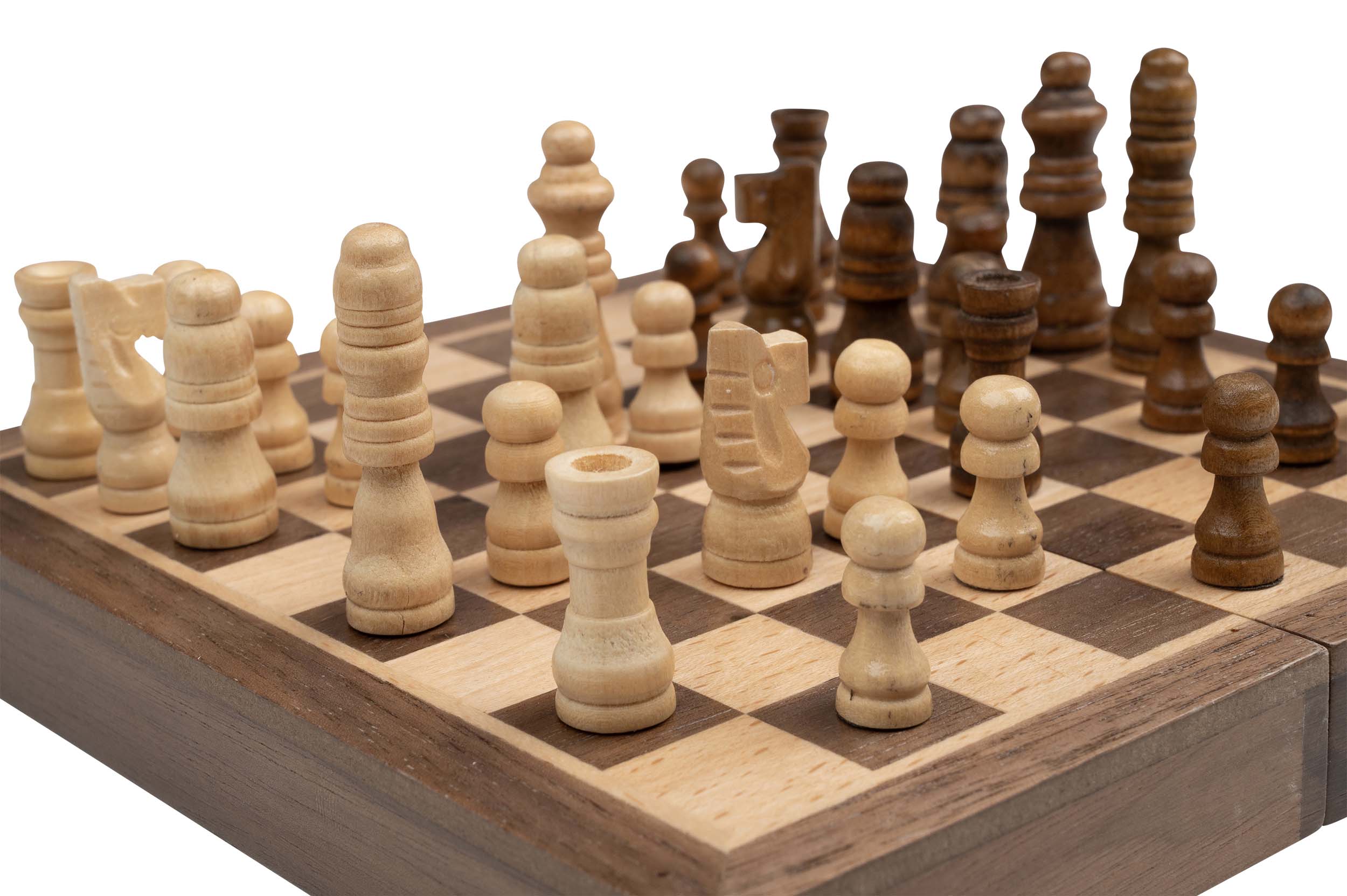 Schachkassette auch prima als Reise-Schach verwendbar. Kassette: MDF, Walnuss, Buche Furnier, Walnuss Furnier, Zierader, Intarsien, magnetisch, Magnetverschluss, Figureneinlage. Feld 16 mm. Figuren: Design Staunton, Schima Holz, natur und braun gebeizt, Filzsockel, magnetisch, König 39 mm. Maße offen: 150 x 150 x 19 mm.