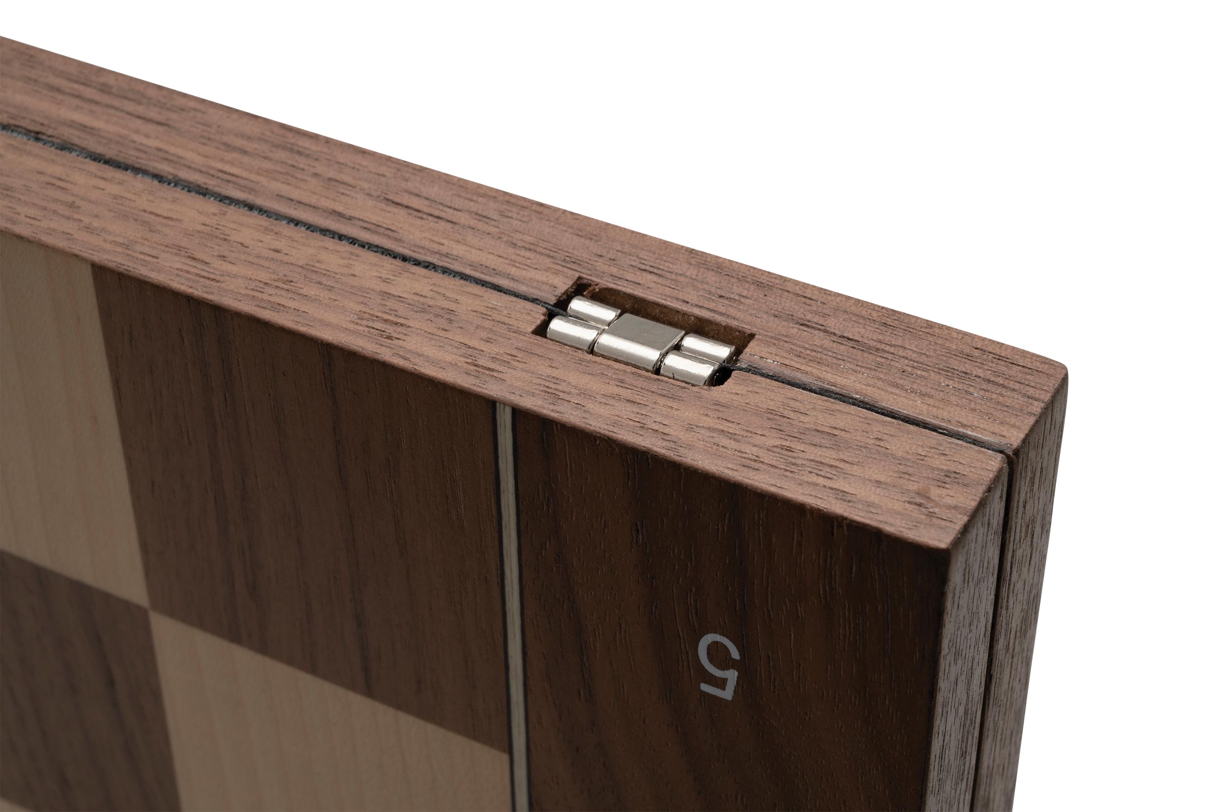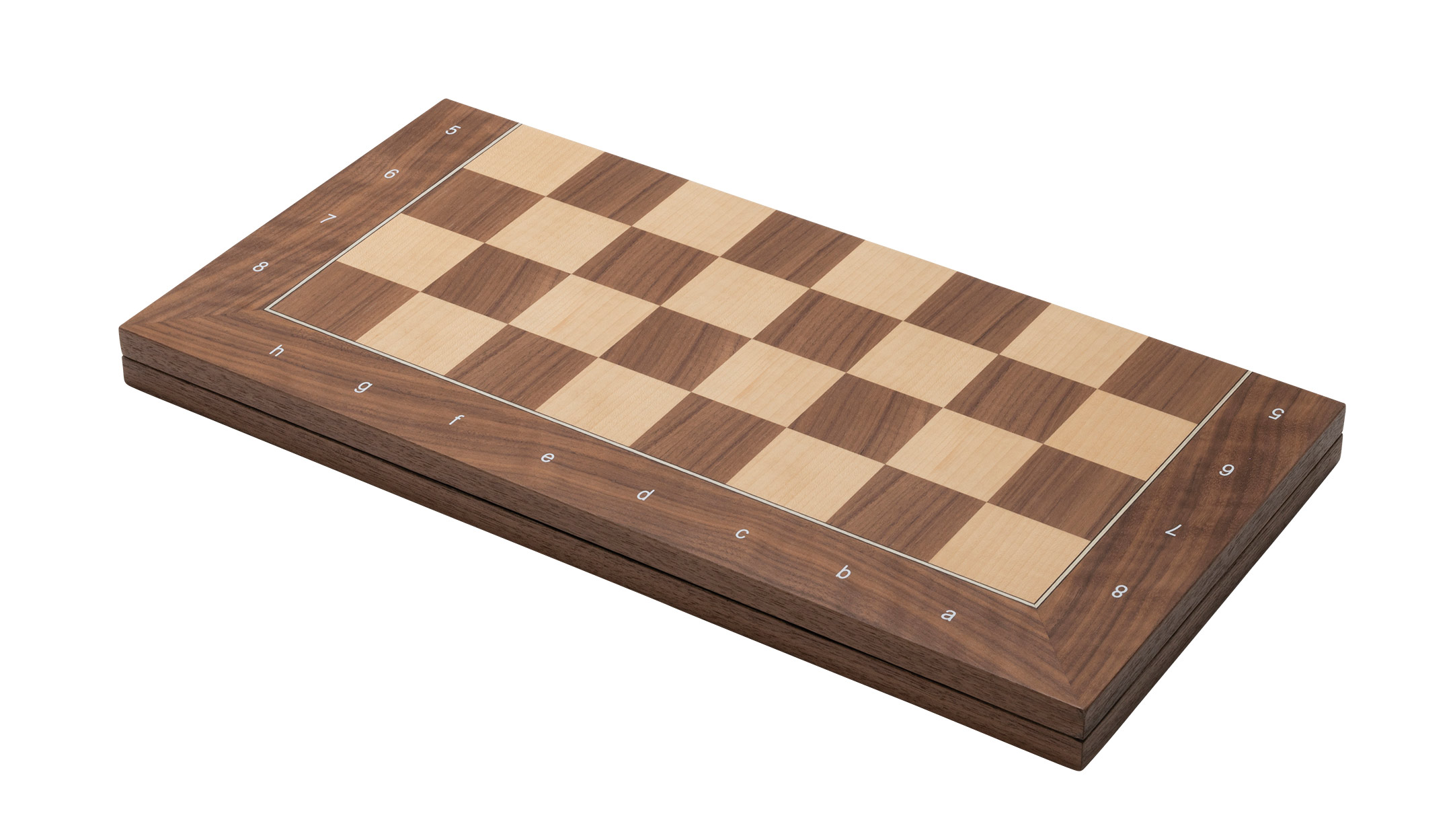 Schachbrett aus MDF mit Walnuss Furnier, Ahorn Furnier , Zierader, Intarsien, Filzuntersetzer, Maße zusammengeklappt 500 x 250 x 33 mm, Feld 50 mm. Tipp: Figuren 2018, 2030, 20301, 2066, 20661, 2115, 21151, 2187, 21871, 2188, 21881, 2230, 22301, 2242, 22421