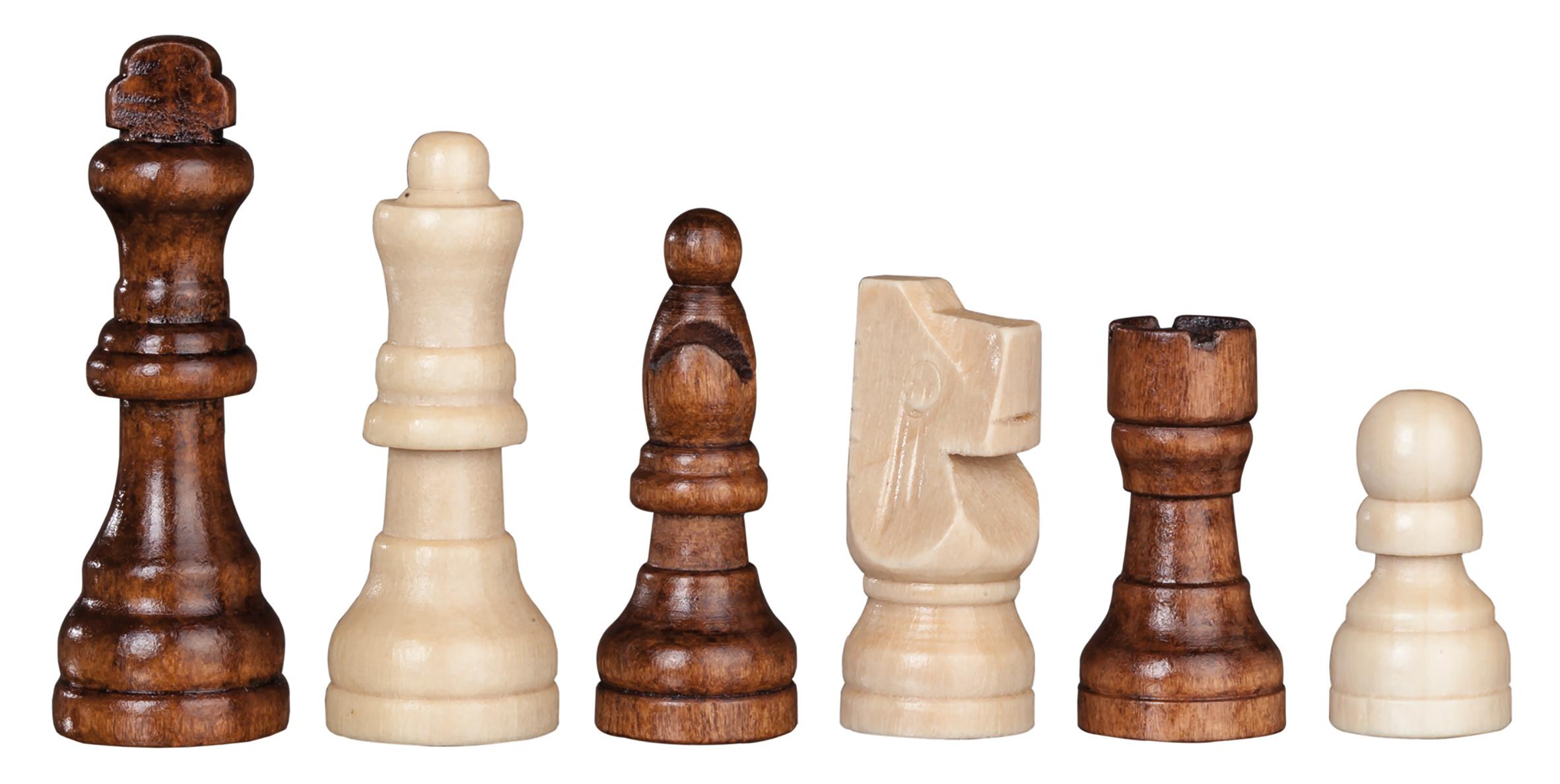 Kassette: MDF, Birke Furnier, Birke, Spielfeld bedruckt, Randbeschriftung, Feld 30 mm. Figuren: Design Staunton, Schima Holz, natur und braun gebeizt, Filzsockel, König 63 mm. Maße Spiel offen: 270 x 270 x 25 mm.