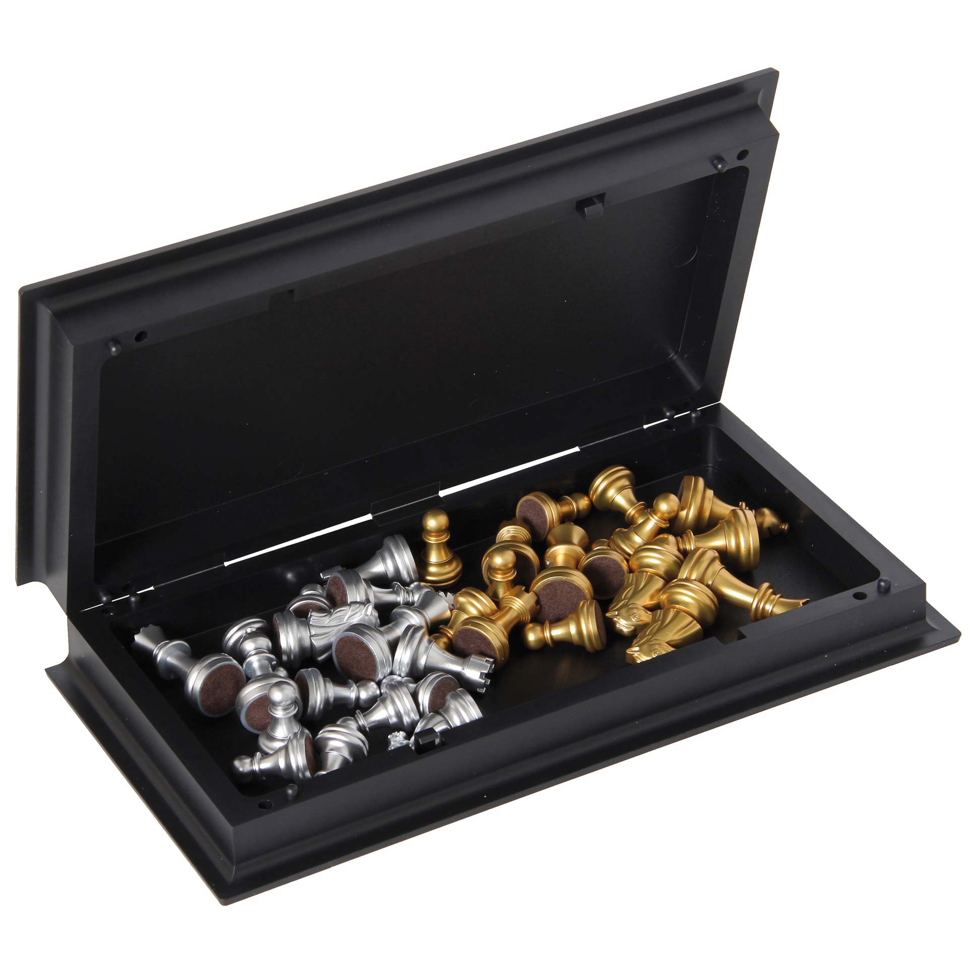 Das klassische Brettspiel ist mit seinen magnetischen Figuren optimal für unterwegs. Die schwarz- und silberfarbene Spielfläche ist klappbar und zugleich Aufbewahrungsbox für die Spielfiguren. Die Königshöhe ist 4,92 cm.