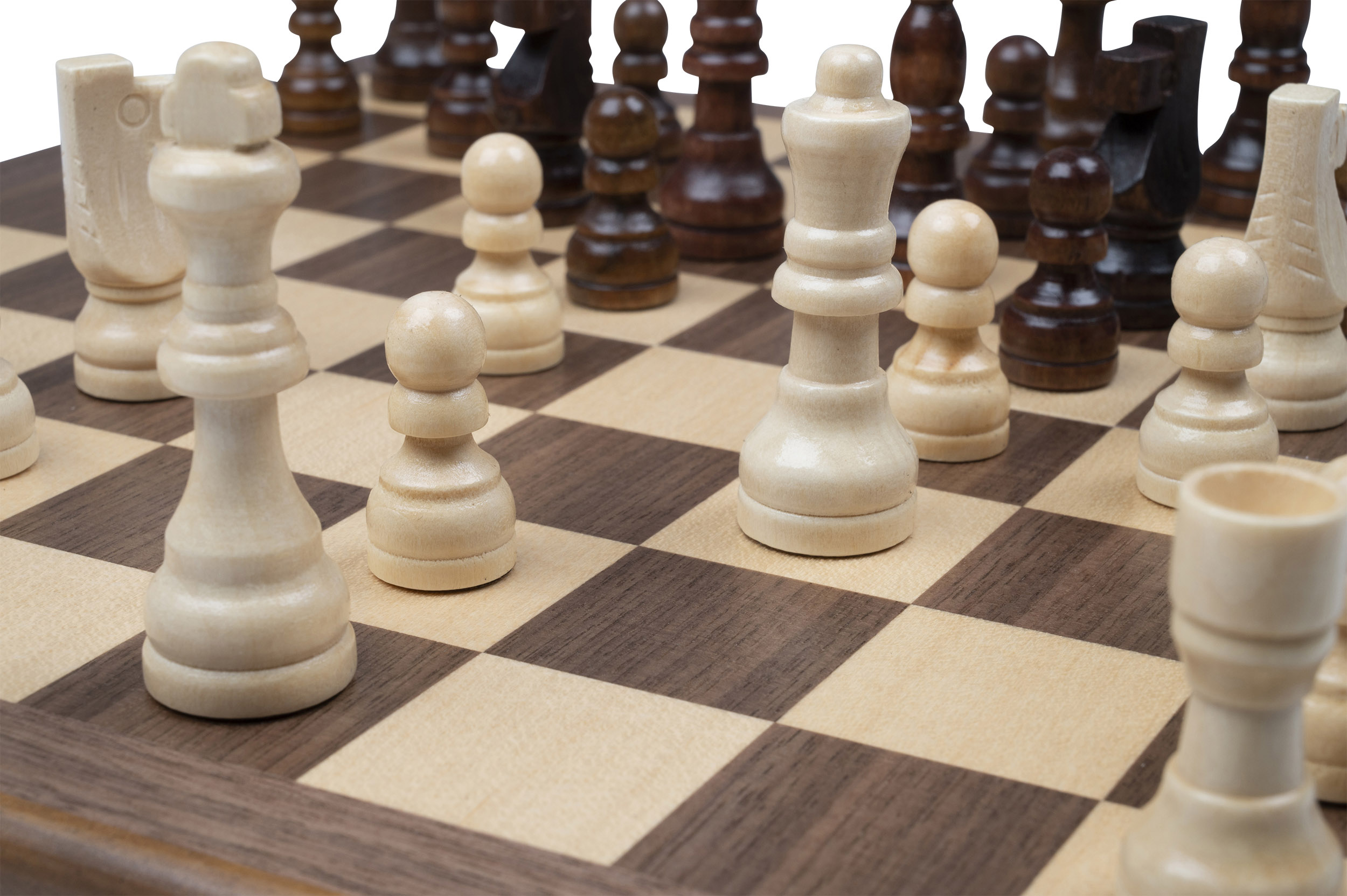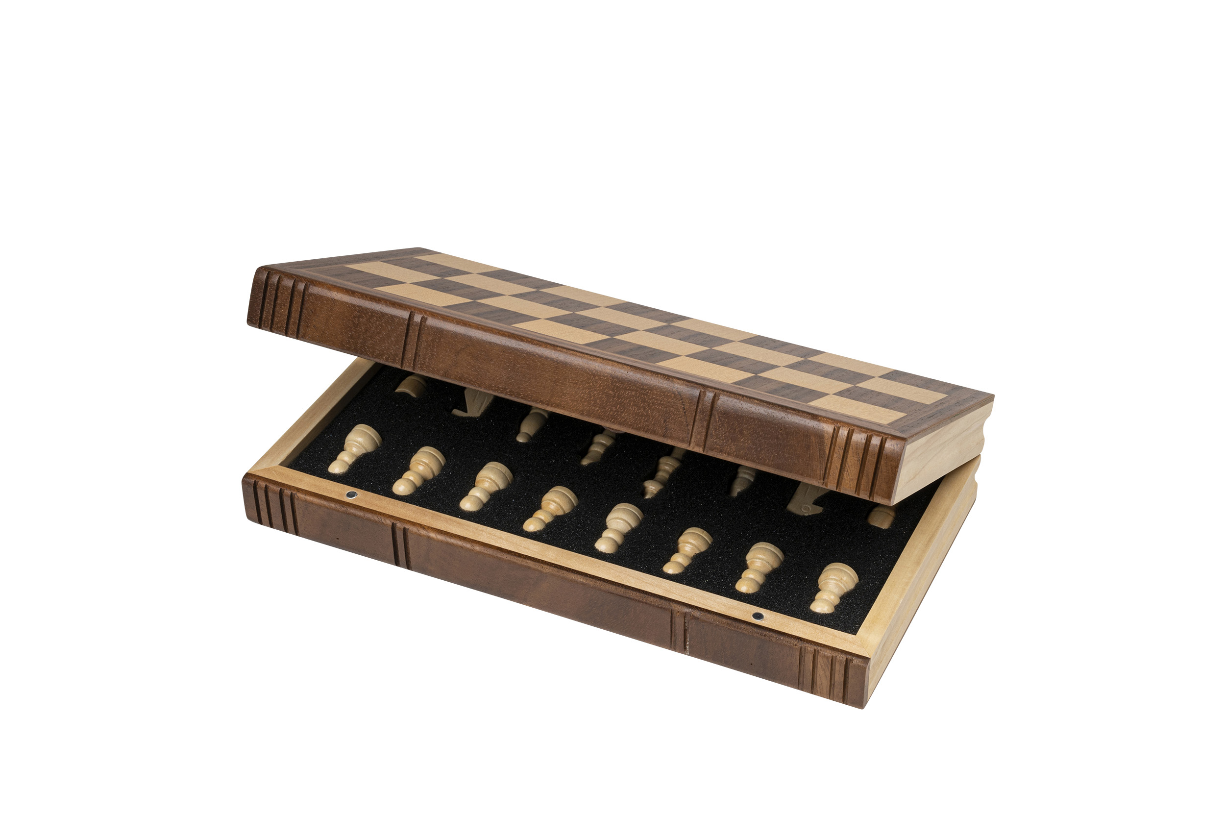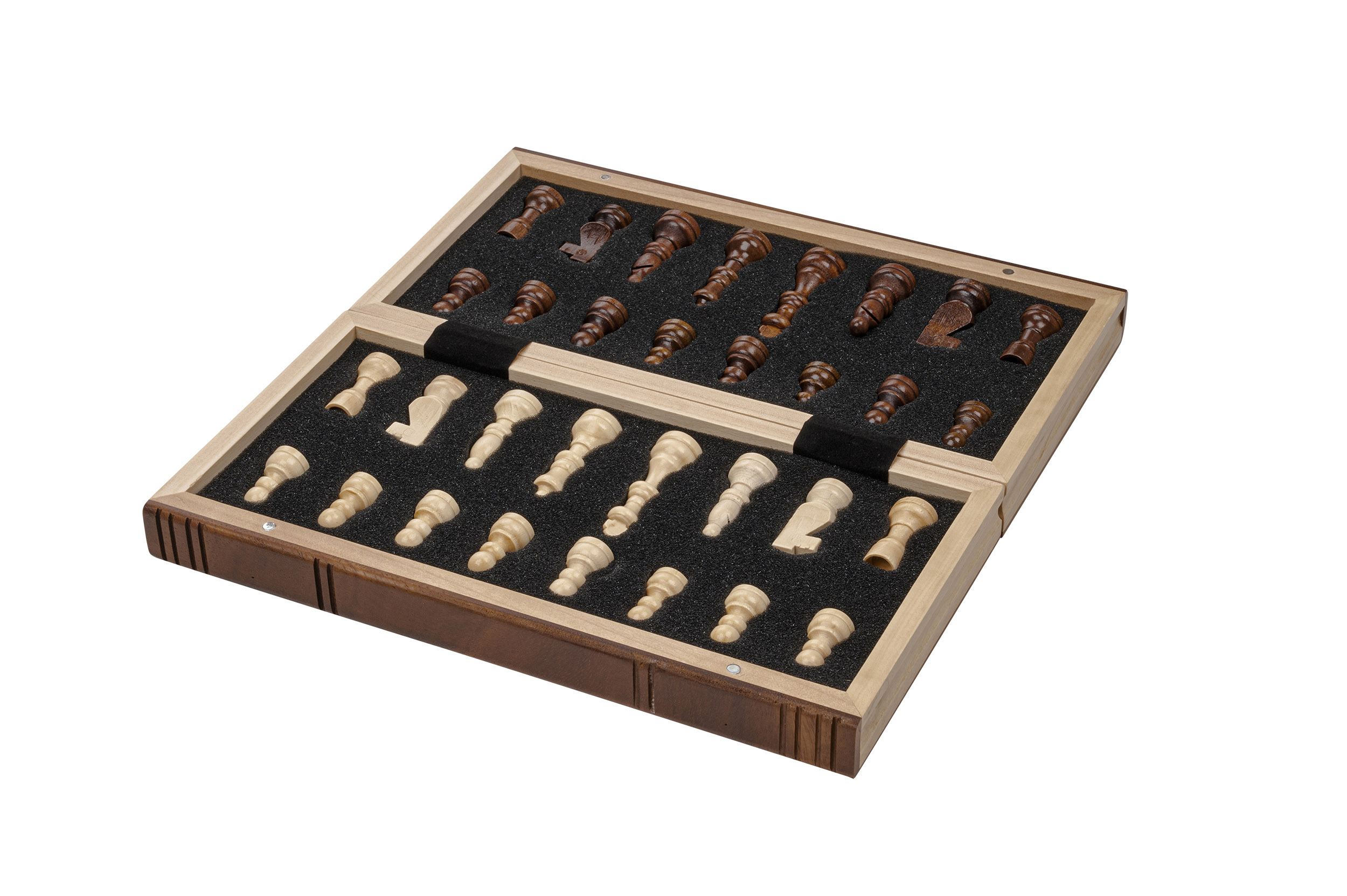 Kassette: MDF, Ahorn Furnier, Walnuss Furnier, Pappel, natur und braun gebeizt, Intarsien, Magnetverschluss, Figureneinlage, Feld 32 mm. Figuren: Design Staunton, Schima Holz, natur und braun gebeizt, Filzsockel, König 60 mm. Maße Spiel offen: 295 x 304 x 27 mm.