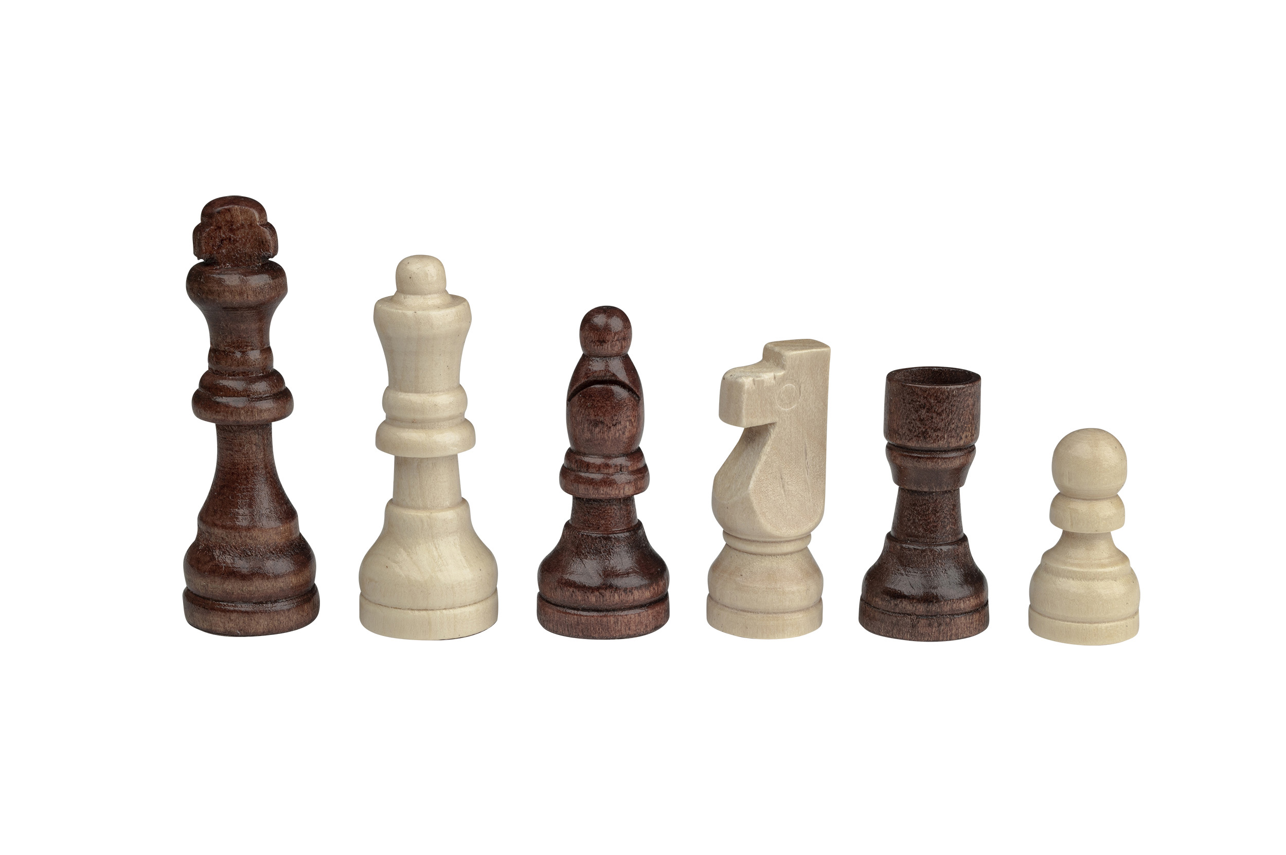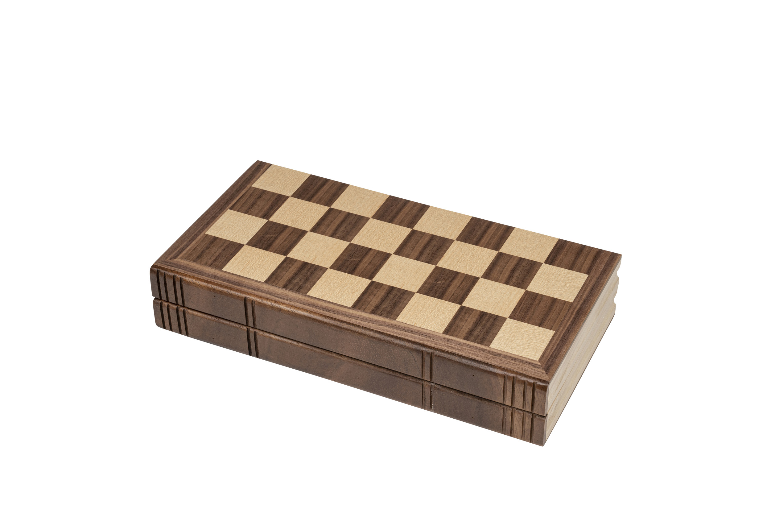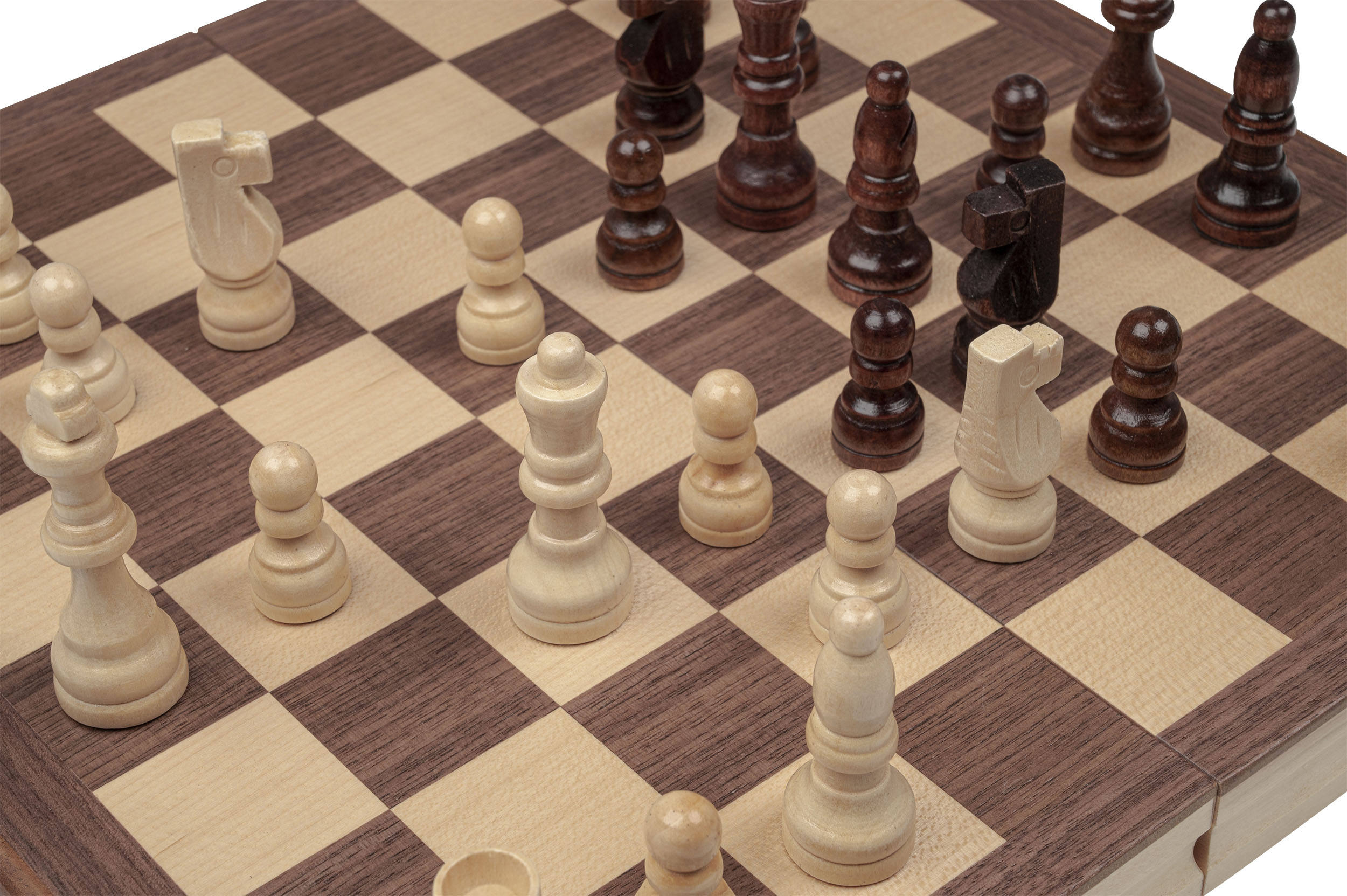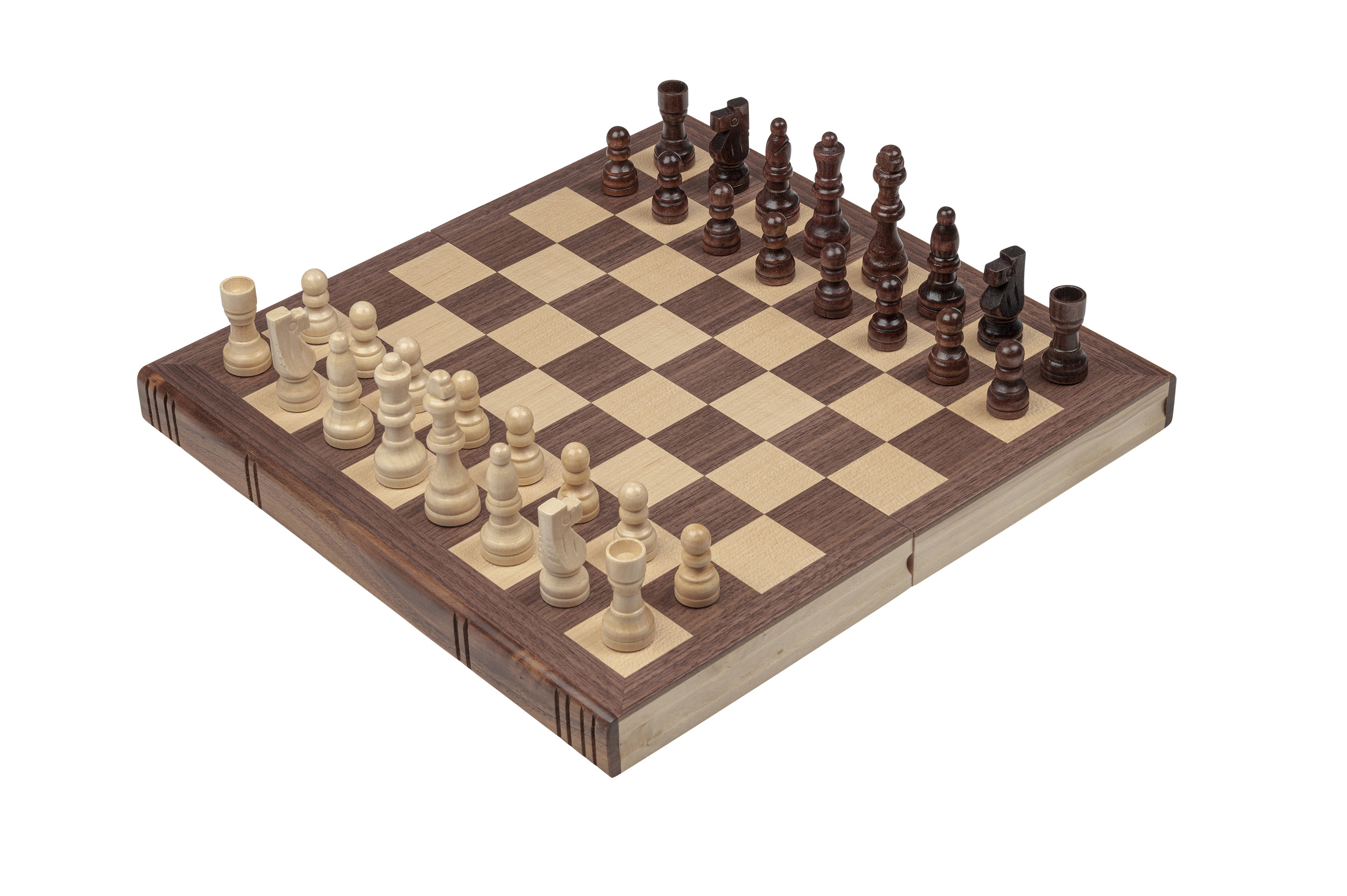 Kassette: MDF, Ahorn Furnier, Walnuss Furnier, Pappel, natur und braun gebeizt, Intarsien, Magnetverschluss, Figureneinlage, Feld 32 mm. Figuren: Design Staunton, Schima Holz, natur und braun gebeizt, Filzsockel, König 60 mm. Maße Spiel offen: 295 x 304 x 27 mm.