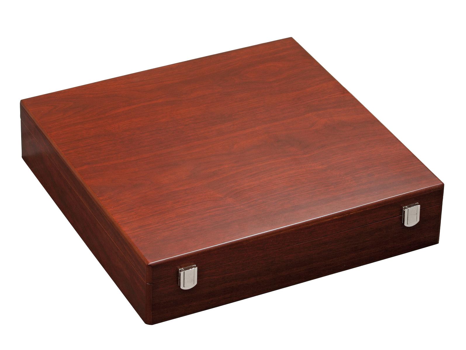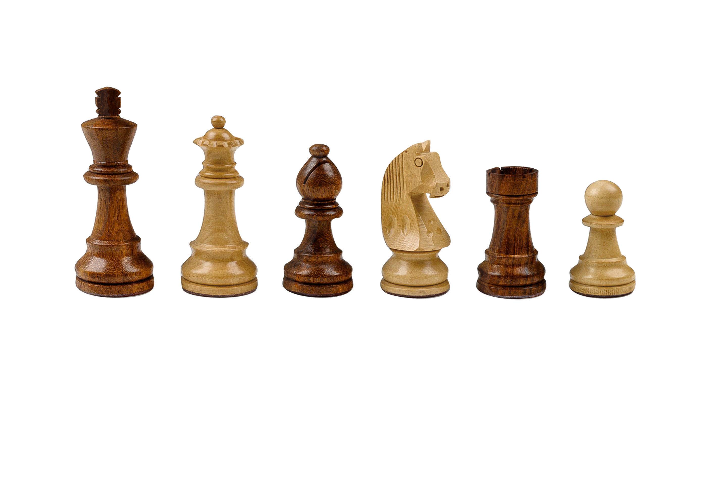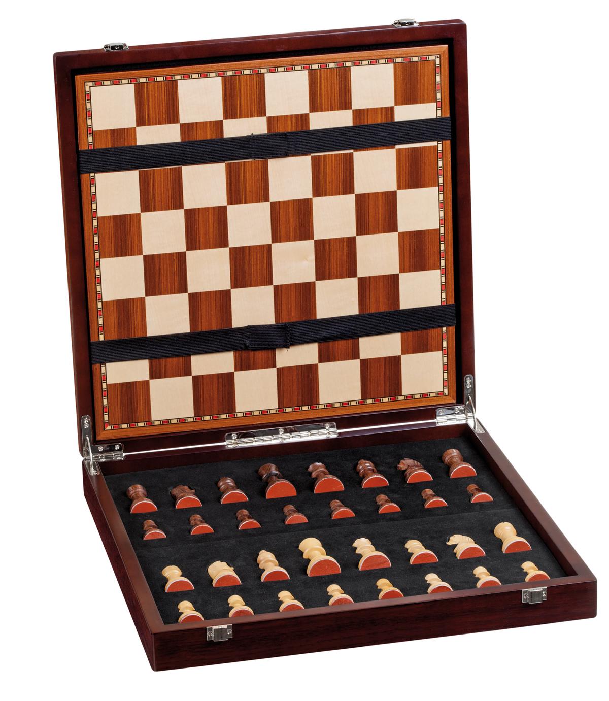 Schachbrett: MDF, Ahorn Furnier, Sapellioptik, dreifache Zierader, Intarsien, Maße 390 x 390 x 10 mm, Feld 45 mm. Figuren: Design Staunton, König 78 mm, Akazie, Buchsbaum natur, poliert, handgeschnitzter Springer, doppelt gewichtet, Ledersockel. Schachfigurenbox: MDF, Furnierpapier, braun gebeizt, Filzinlett, Maße 430 x 430 x 65 mm, mit Einzelfächern für die Schachfiguren.