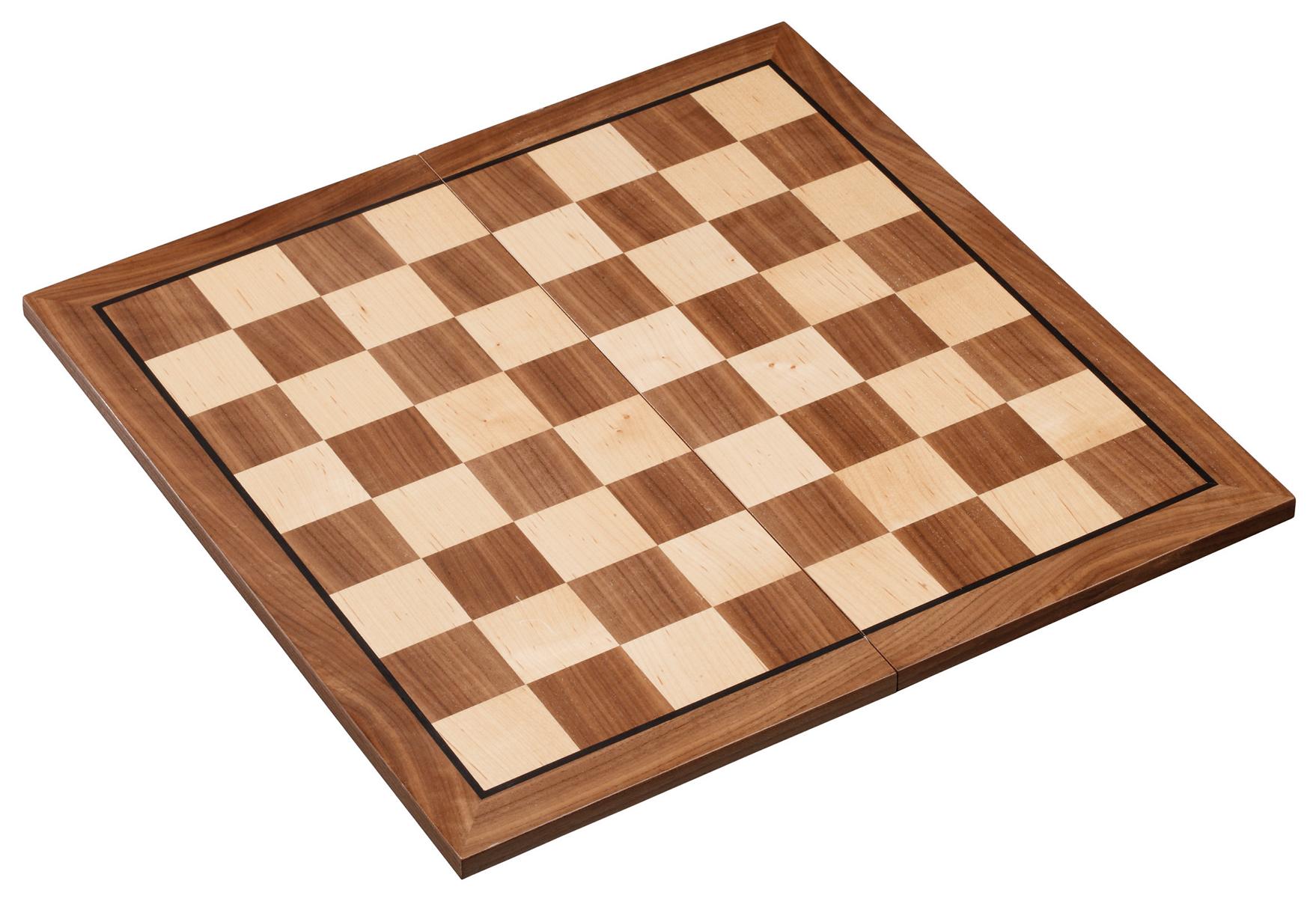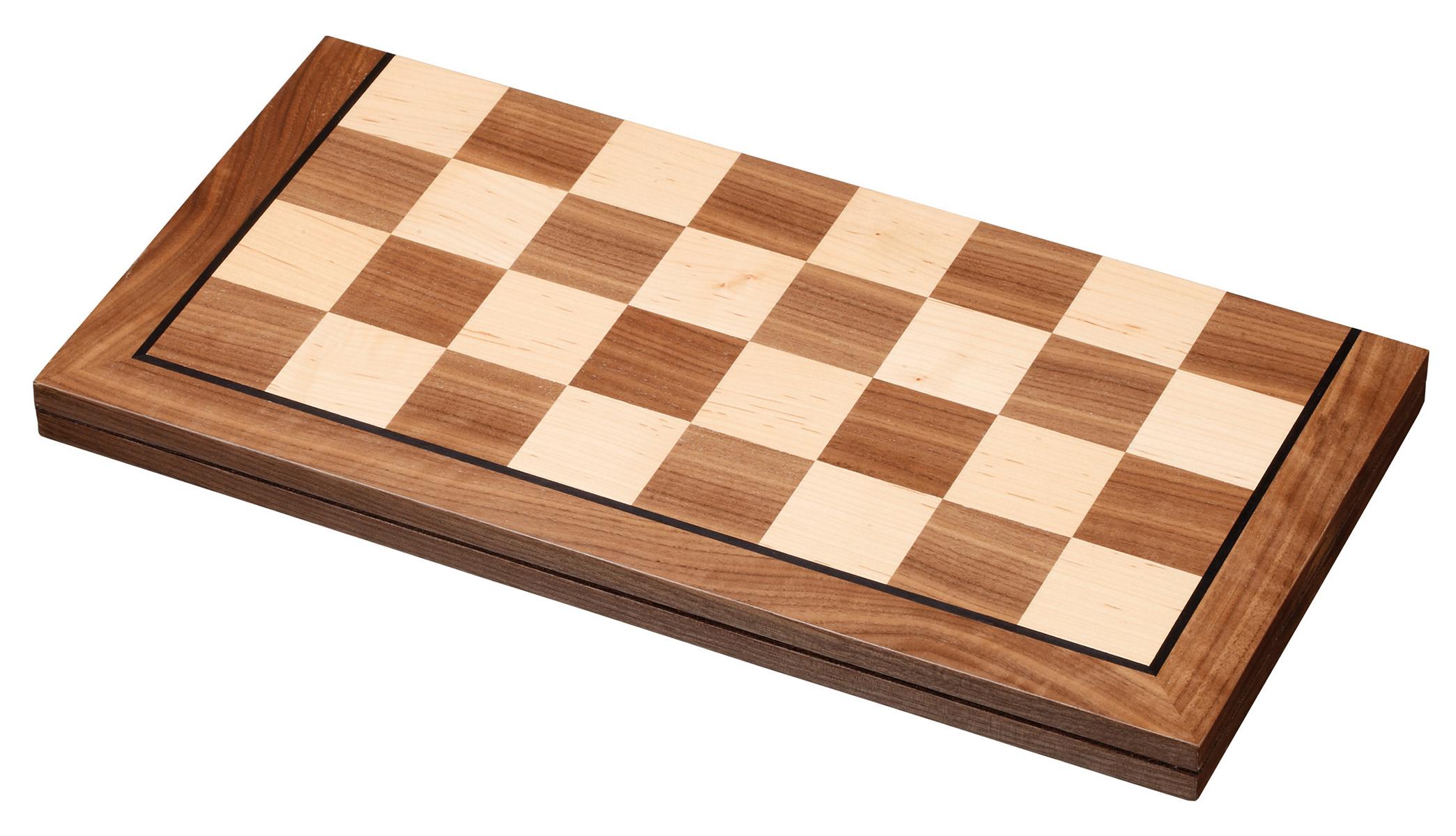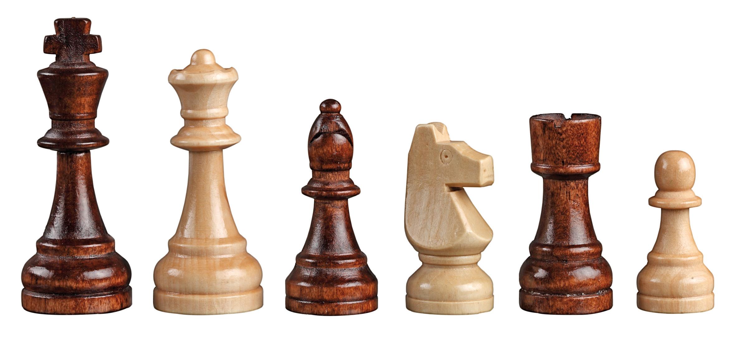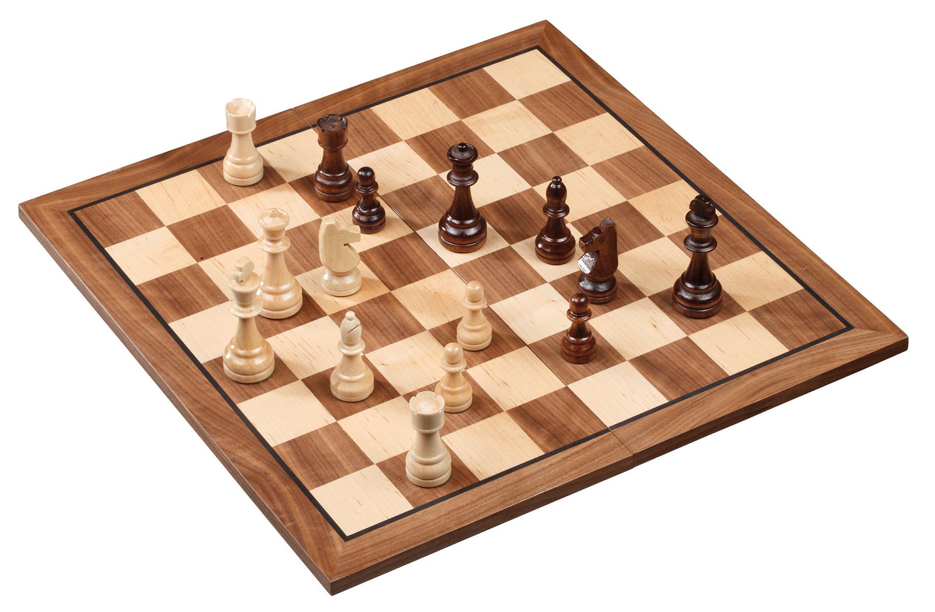Schachbrett: MDF, Walnuss Furnier, Ahorn Furnier, Zierader, Intarsien, Maße 460 x 460 x 13 mm, Feld 50 mm, klappbar. Figuren: Design Staunton, Schima Holz, natur und braun gebeizt, KH 90 mm, Filzsockel. Mit Stoffbeutel für Schachfiguren.