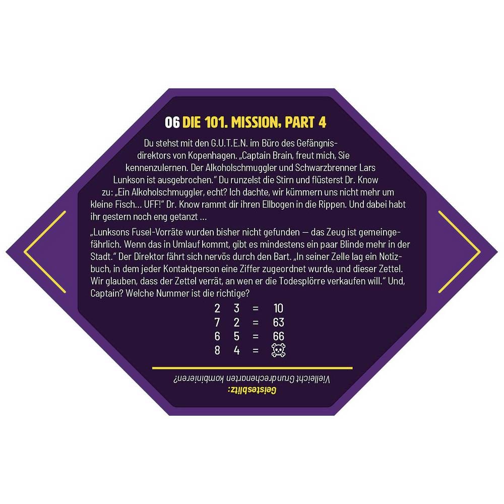 Wenn Aliens die Erde attackieren, Superschurken die Regierung erpressen oder eine Katze auf dem Baum sitzt, dann ist das ein Fall für Captain Brain. Diese bunte Rätselmischung ist ein Fest für alle Freunde des Superhelden-Genres. Schlüpfen Sie in die Rolle von Captain Brain, Superheld des logischen Denkens, Kombinierens und Beobachtens. Die Welt ist in Gefahr und nur Captain Brain und sein Team kann sie abwenden, indem super knifflige und gefährliche Rätsel gelöst werden. Klingt wie ein Escape-Game? Ist es auch! Die Rätsel sind mindestens so aufregend, aber nicht ganz so zeitintensiv wie ein ganzes Escape-Room-Spiel. Der perfekte Zeitvertreib also für alle, die gerade keine Zeit für ein ganzes Escape-Game haben.