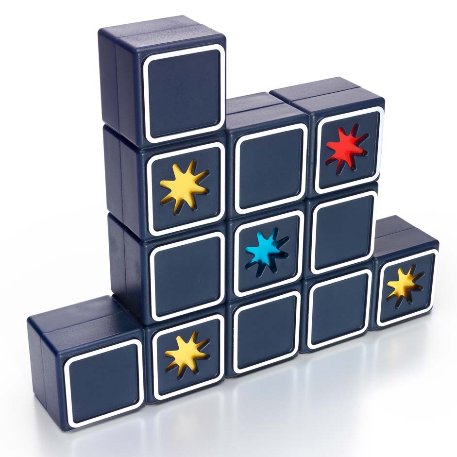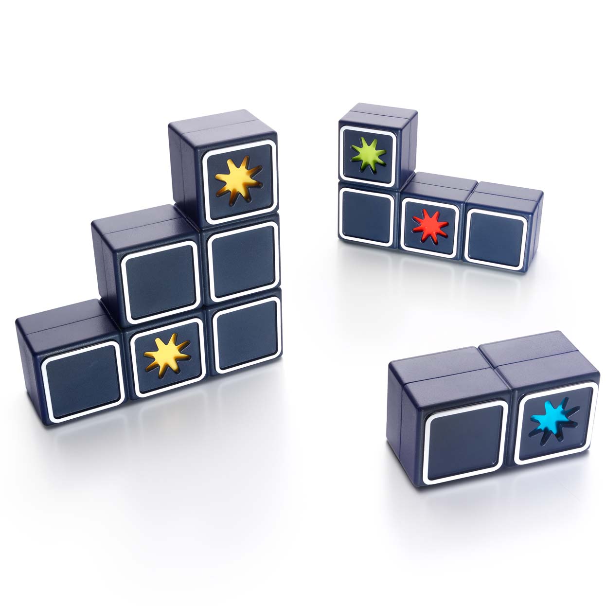 Kannst du die Blöcke so zusammenstellen, dass alle Sterne zu erkennen sind wie in der Aufgabe vorgegeben? Aber Achtung: auch die Blöcke scheinen magische Kräfte zu haben! Kaum bewegt man die Blöcke, wechseln die Sterne ihre Farbe oder verschwinden ganz!