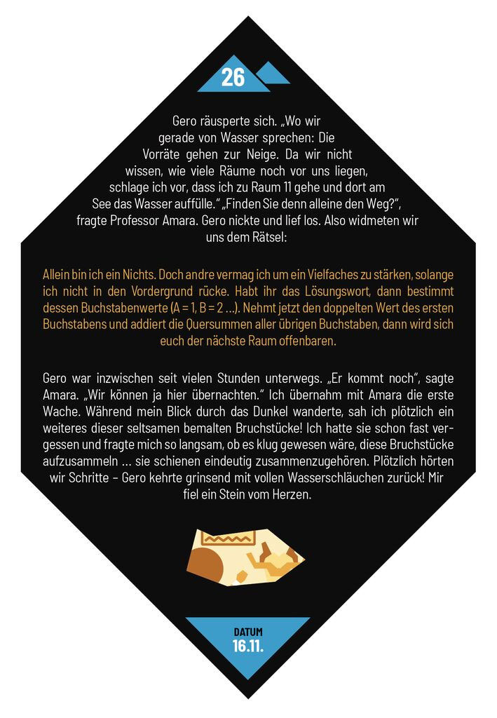 Das Team um den renommierten Ägyptologen Professor Carabosso startete vor einigen Tagen mit der Erkundung einer neu entdeckten Grabanlage und gilt seitdem als vermisst. Eine Rettungsmission, die das Team ausfindig machen und bergen sollte, kehrte ebenfalls nicht zurück. Jetzt kommen Sie ins Spiel: Schaffen Sie es, die Rätsel zu lösen und sowohl Professor Carabosso als auch die Rettungsmannschaft vor dem Verderben zu bewahren? Klingt wie ein Escape-Game? Ist es auch! Die Rätsel sind mindestens so aufregend, aber nicht ganz so zeitintensiv wie ein ganzes Escape-Room-Spiel. Der perfekte Zeitvertreib also für alle, die gerade keine Zeit für ein ganzes Escape-Game haben. Erleben Sie Wolfgang Kramers Escape-Klassiker Die Rätsel der Pyramide in einer neuen, fordernden Version!