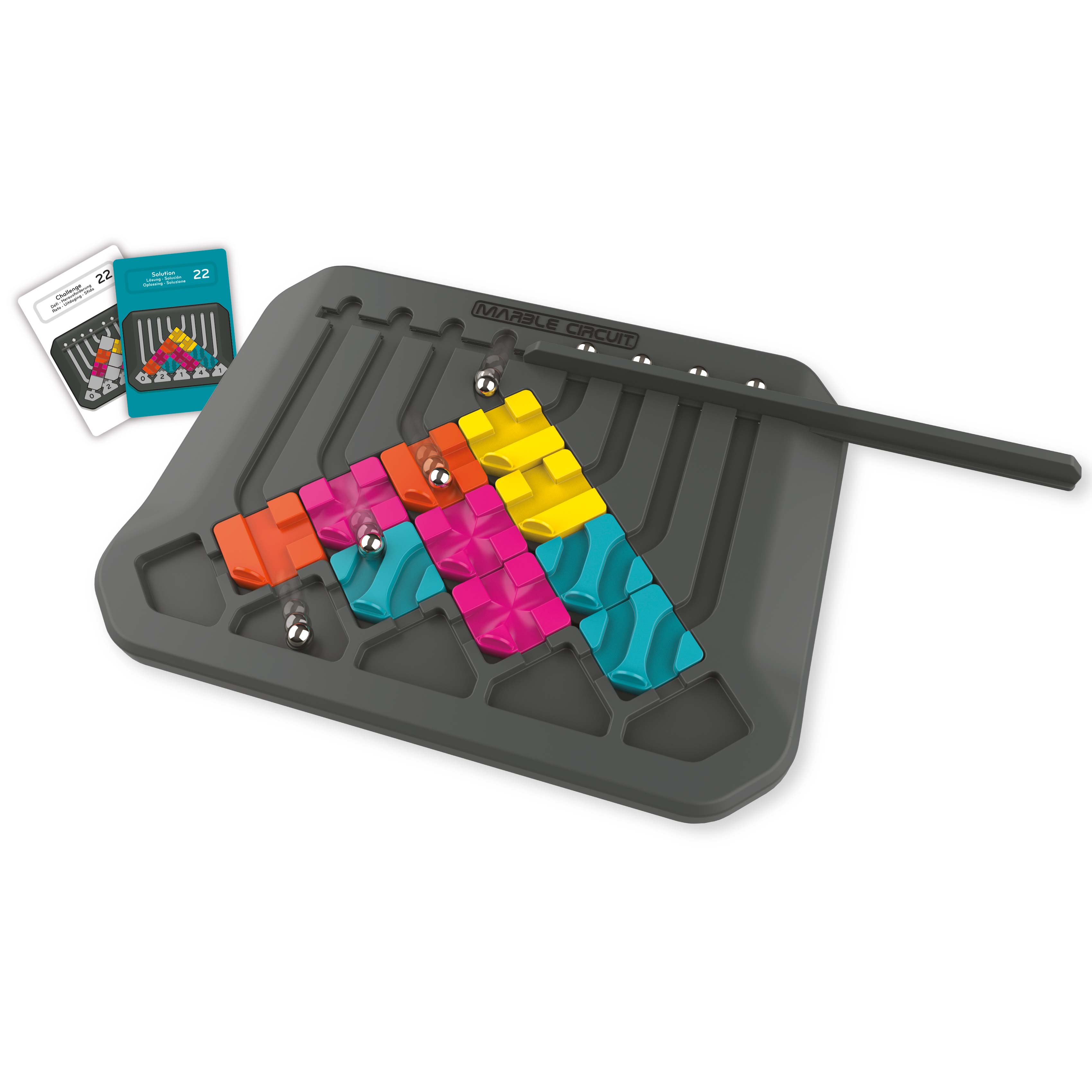 Das Logicspiel der Wege und Möglichkeiten! Wählen Sie eine Herausforderungskarte und legen Sie die Startfelder wie auf der Karte angegeben auf das Spielbrett. Beachten Sie die Zahlen in den Zielfeldern aus der Karte. Diese Zahlen geben die Anzahl der Murmeln an, die in den Zielfeldern enden sollen. Sagen Sie die Wege der Murmeln voraus und legen Sie die verbleibenden geheimnissvollen Felder aus das Spielbrett. Schieben Sie das Tor langsam nach rechts um die Murmeln freizugeben. Lagen Sie richtig? Ab 8 Jahren, für 1 Spieler. 64 Aufgaben.