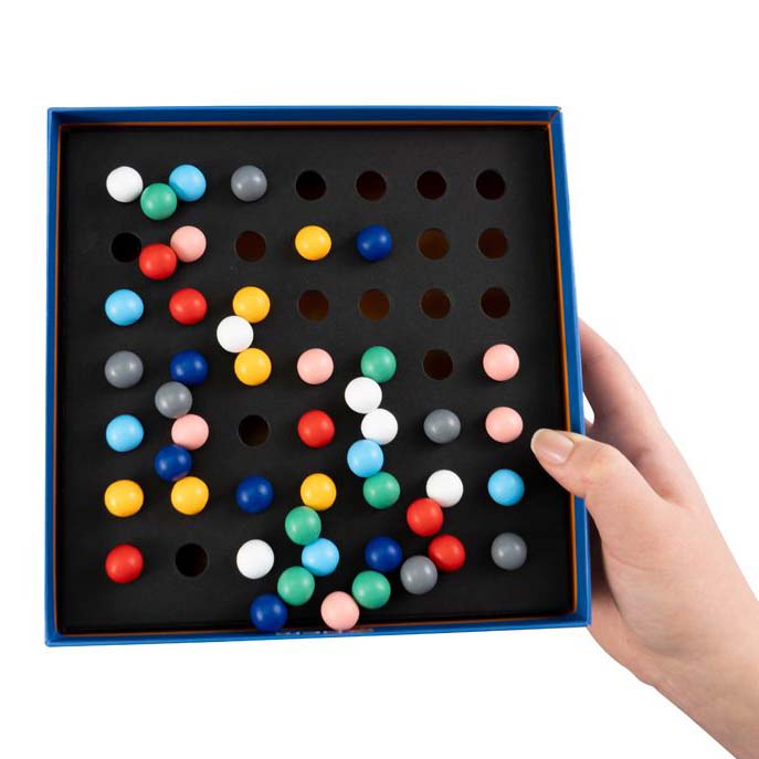 Dies ist ein außergewöhnliches Spiel. Es ist einfach ruhig. Zu Beginn liegen hölzerne Murmeln in zufälliger Reihenfolge. Du beruhigst dich. Konzentration. Und dann beginnst du, die Murmeln nach Farbe zu gruppieren. Wechsle dich mit deinem Partner ab, arbeite zusammen aber ohne zu sprechen. Verwende so wenige Züge wie möglich. Teile das Ziel, wählt eure Herangehensweisen. In Stille. Bleibe fokussiert.