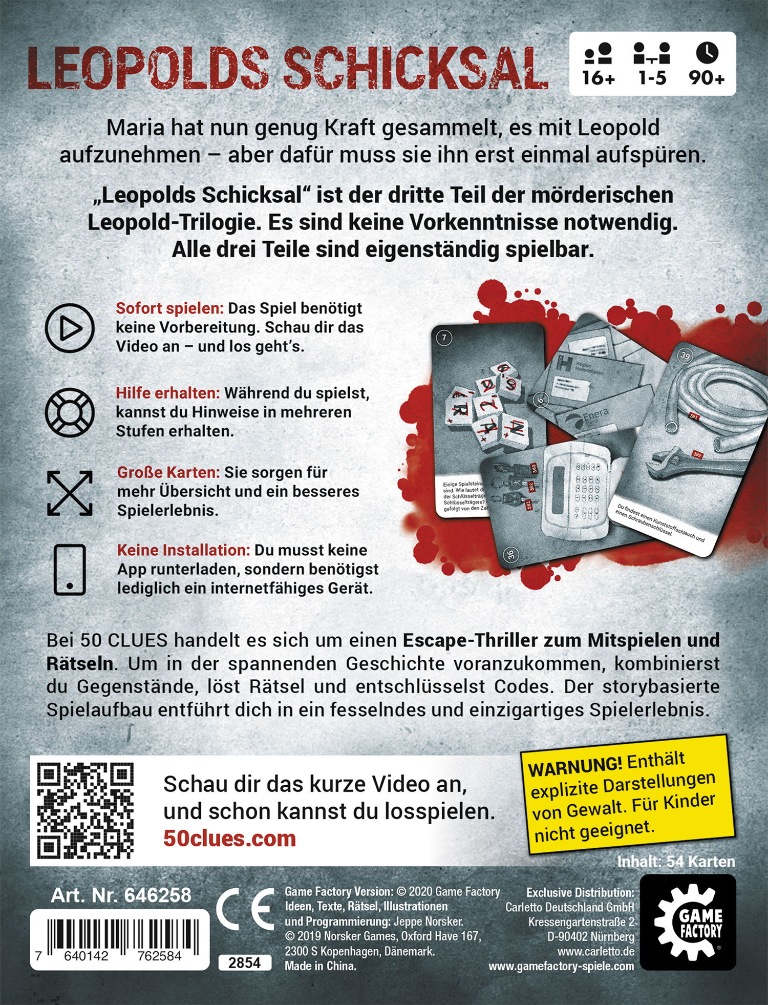 Leopolds Schicksal ist der dritte Teil der mörderischen Leopold-Trilogie. Es sind keine Vorkenntnisse notwendig. Alle drei Teile sind eigenständig spielbar. Maria hat nun genug Kraft gesammelt, es mit Leopold aufzunehmen aber dafür muss sie ihn erst einmal aufspüren. Bei 50 CLUES handelt es sich um einen Escape-Thriller zum Mitspielen und Rätseln. Um in der spannenden Geschichte voranzukommen, kombinierst du Gegenstände, löst Rätsel und entschlüsselst Codes. Der storybasierte Spielaufbau entführt dich in ein fesselndes und einzigartiges Spielerlebnis.