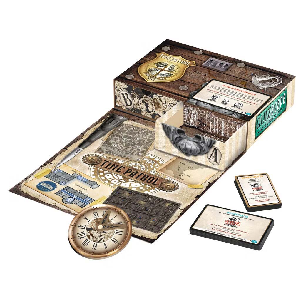 Eine Schachtel voller Überraschungen, drei spannende Zeitreise-Abenteuer und eine einzigartige Kombination aus Quizfragen und Escape-Feeling das ist QUIZscape. Das neuartige Spielkonzept ist perfekt für Einsteiger geeignet und ermöglicht einen schnellen Spieleinstieg. Anders als bei anderen Escape-Games lässt sich das Spiel komplett in den Ursprungszustand zurücksetzen, das gesamte Material bleibt unversehrt.