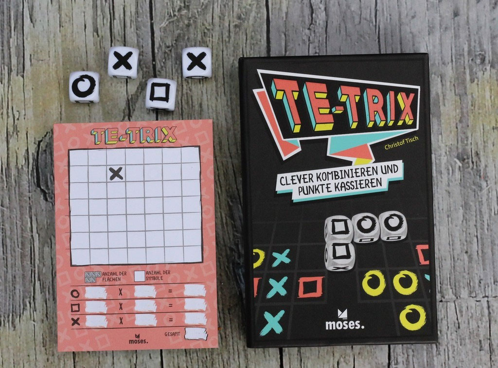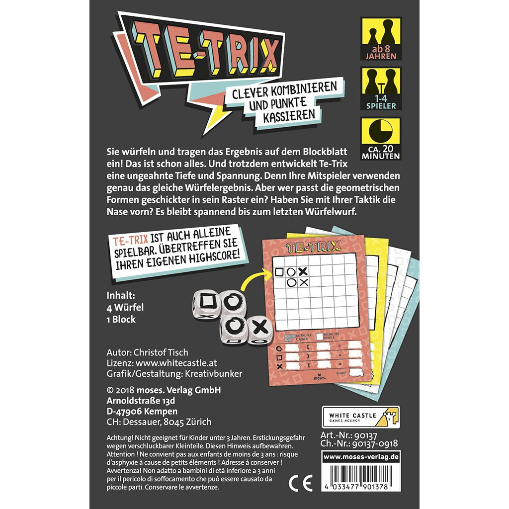 Clever kombinieren und Punkte kassieren! Bei diesem Spiel würfelt man und trägt das Ergebnis auf dem Block ein! Das ist schon alles. Und trotzdem entwickelt Te-Trix eine ungeahnte Tiefe und Spannung. Denn die Mitspieler verwenden genau das gleiche Würfelergebnis. Aber wer passt die geometrischen Formen geschickter in sein Raster ein? Es bleibt spannend bis zum letzten Würfelwurf. Natürlich kann Te-Trix auch alleine gespielt werden, so kann man seinen eigenen Highscore immer und immer wieder knacken!