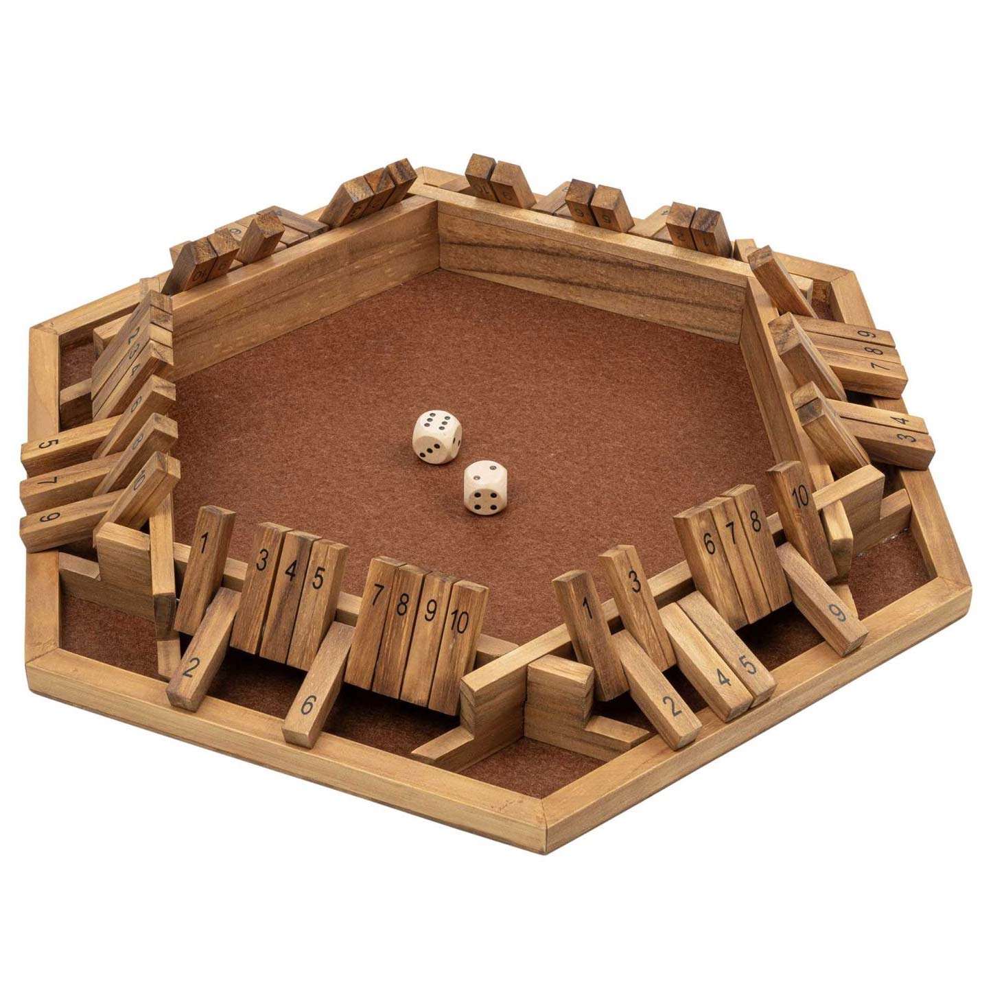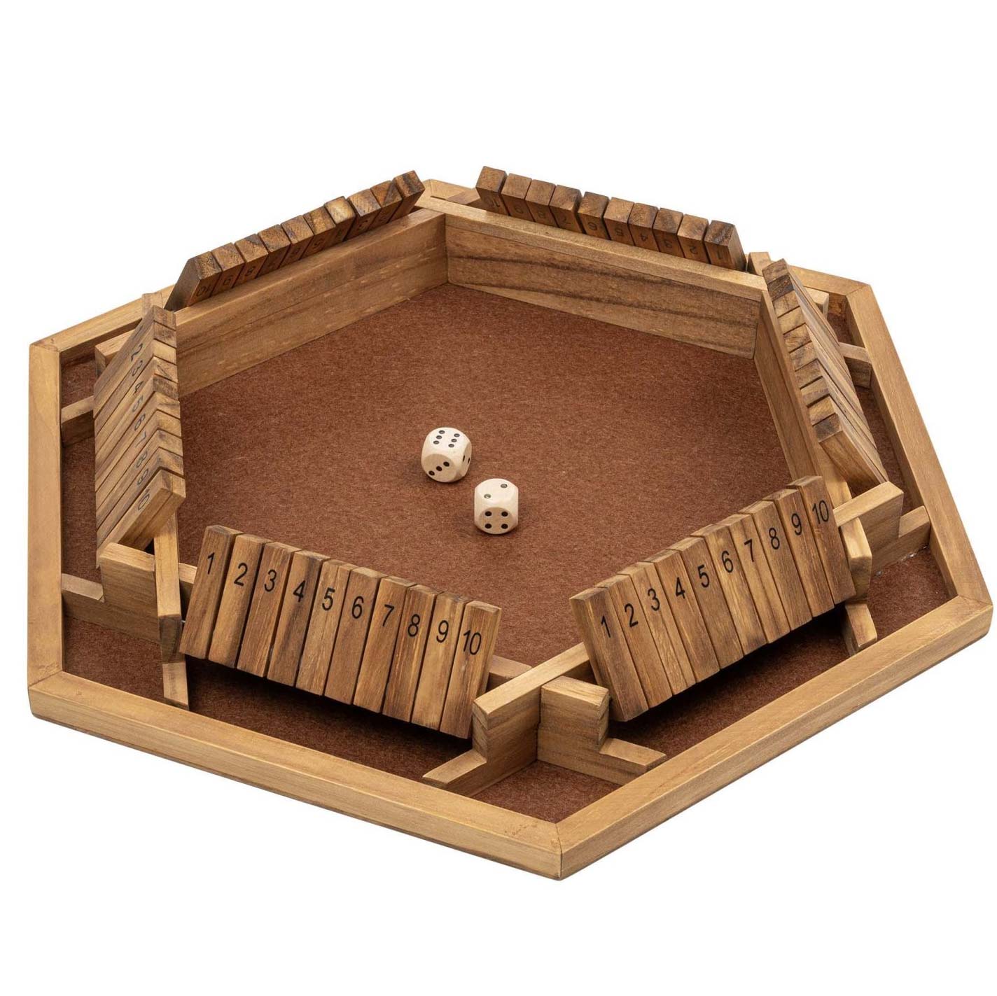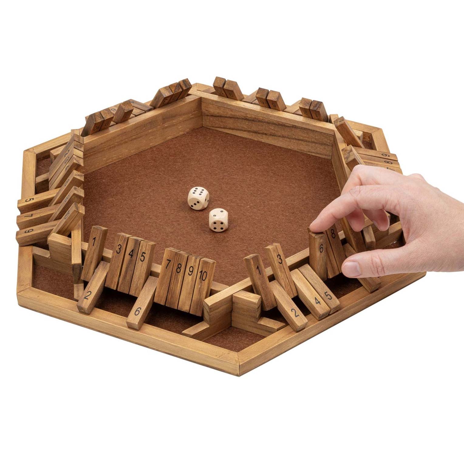 Shut the Box ist ein einfaches, aber sehr spannendes Würfelspiel für beliebig viele Personen. Dabei werden nach jedem Wurf mit den Würfeln entsprechend der angezeigten Augenzahl eine oder mehrere Zahlen umgeklappt. Ziel des Spiels ist es, alle schwenkbaren Zahlenklappen zu schließen. Mit dieser Variante können bis zu 6 Spieler gleichzeitig spielen.