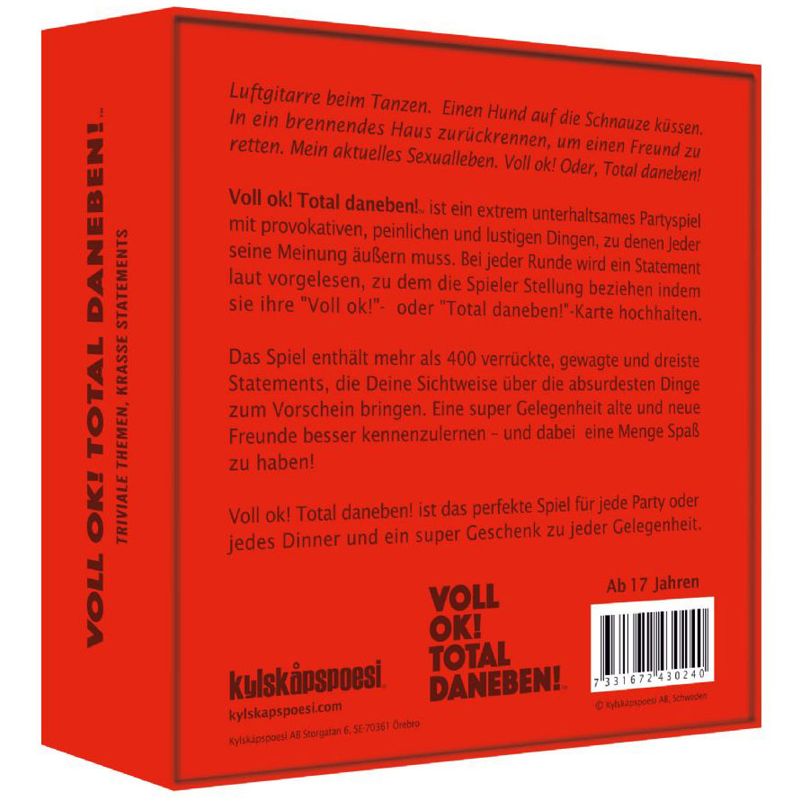 Voll ok! Total daneben! ist ein extrem unterhaltsames Partyspiel mit provokativen, peinlichen und lustigen Dingen, zu denen Jeder seine Meinung äußern muss. Bei jeder Runde wird ein Statement laut vorgelesen, zu dem die Spieler Stellung beziehen indem sie ihre Voll ok!- oder Total daneben!-Karte hochhalten.