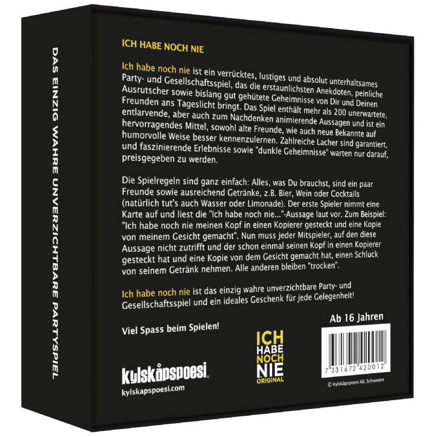Ich habe noch nie ist ein verrücktes, lustiges und absolut unterhaltsames Party- und Gesellschaftsspiel, das die erstaunlichsten Anekdoten, peinliche Ausrutscher sowie bislang gut gehütete Geheimnisse von Dir und Deinen Freunden ans Tageslicht bringt.