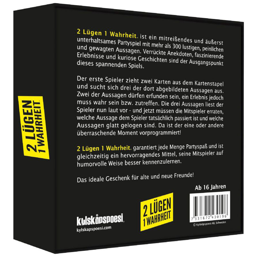 2 Lügen. 1 Wahrheit. garantiert jede Menge Partyspaß und ist gleichzeitig ein hervorragendes Mittel, seine Mitspieler auf humorvolle Weise besser kennenzulernen. Ein verrücktes, elektrisierendes Spiel und das ideale Geschenk für alte und neue Freunde!