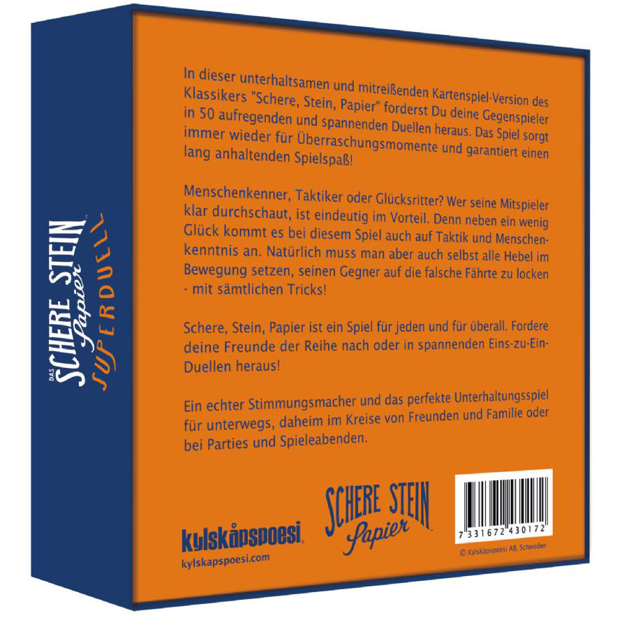 Menschenkenner, Taktiker oder Glücksritter? Wer seine Mitspieler klar durchschaut, ist eindeutig im Vorteil. Denn neben ein wenig Glück kommt es bei diesem Spiel auch auf Taktik und Menschenkenntnis an. Natürlich muss man aber auch selbst alle Hebel im Bewegung setzen, seinen Gegner auf die falsche Fährte zu locken mit sämtlichen Tricks! Schere, Stein, Papier ist ein Spiel für jeden und für überall. Fordere deine Freunde der Reihe nach oder in spannenden Eins-zu-Ein-Duellen heraus!