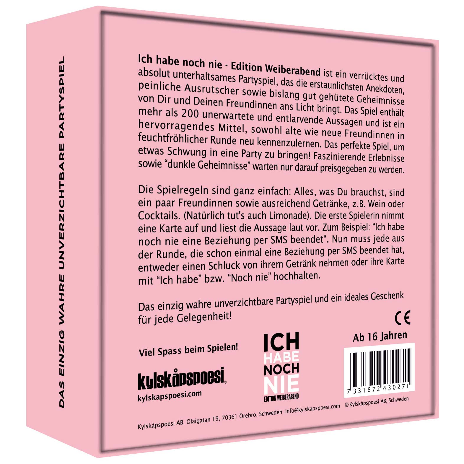 Das Spiel enthält mehr als 200 unerwartete und entlarvende Aussagen und ist ein hervorragendes Mittel, sowohl alte als auch neue Freundinnen in feuchtfröhlicher Runde neu kennenzulernen. Das perfekte Spiel, um etwas Schwung in eine Party zu bringen! Faszinierende Erlebnisse sowie dunkle Geheimnisse warten nur darauf, preisgegeben zu werden.