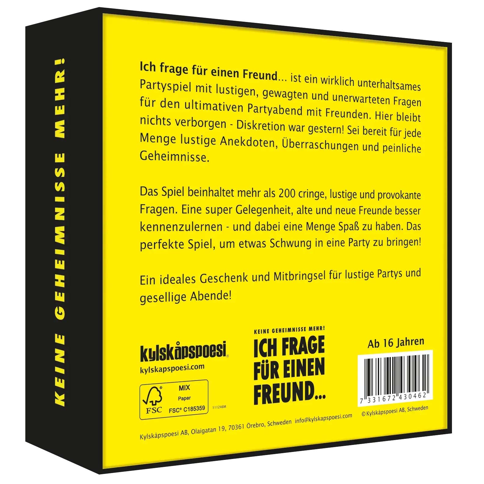 Ich frage für einen Freund... ist ein wirklich unterhaltsames Partyspiel mit lustigen, gewagten und unerwarteten Fragen für den ultimativen Partyabend mit Freunden. Hier bleibt nichts verborgen - Diskretion war gestern! Sei bereit für jede Menge lustige Anekdoten, Überraschungen und peinliche Geheimnisse.