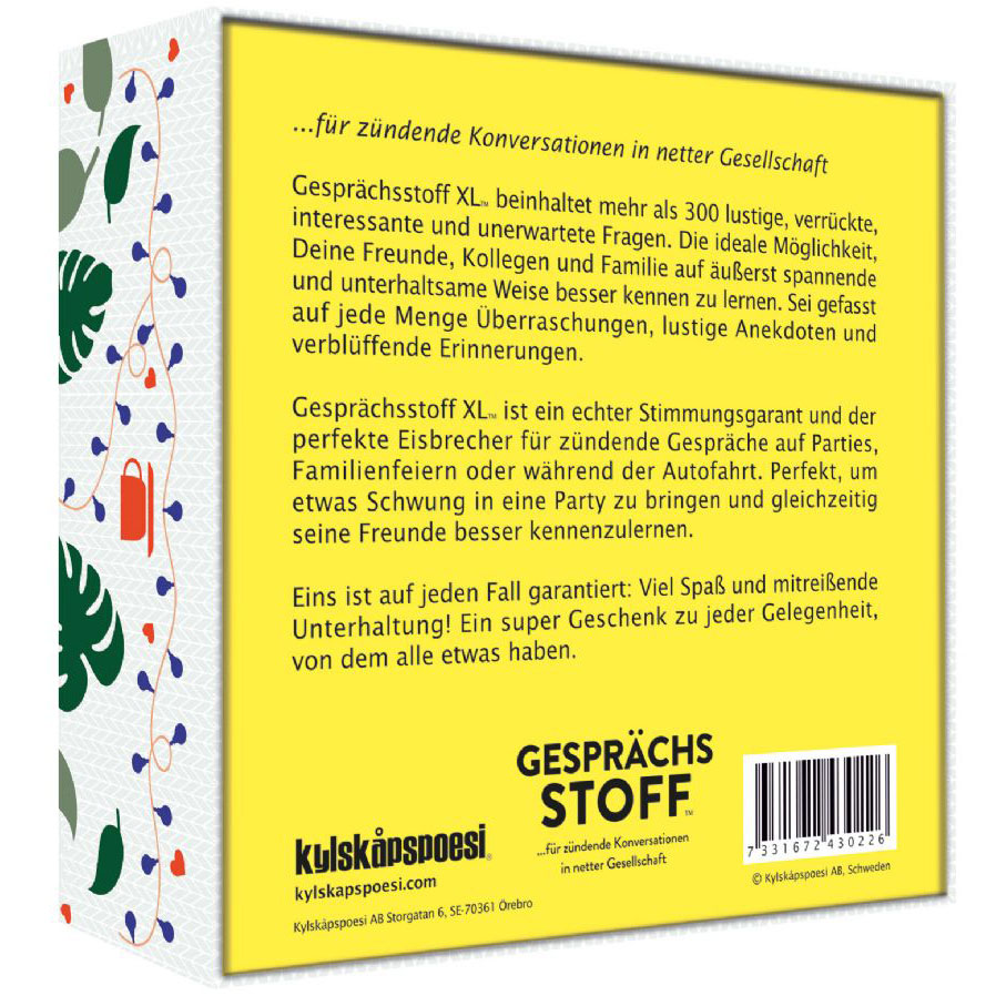 Gesprächsstoff ist ein echter Stimmungsgarant und der perfekte Eisbrecher für zündende Gespräche auf Parties, Familienfeiern oder während der Autofahrt. Perfekt, um etwas Schwung in eine Party zu bringen und gleichzeitig seine Freunde besser kennenzulernen.