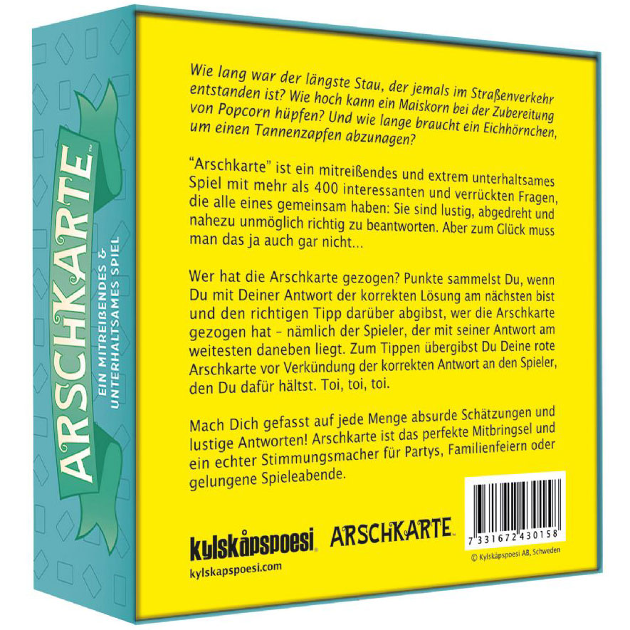 Mach Dich gefasst auf jede Menge absurde Schätzungen und lustige Antworten! Arschkarte ist das perfekte Mitbringsel und ein echter Stimmungsmacher für Partys, Familienfeiern oder gelungene Spieleabende.