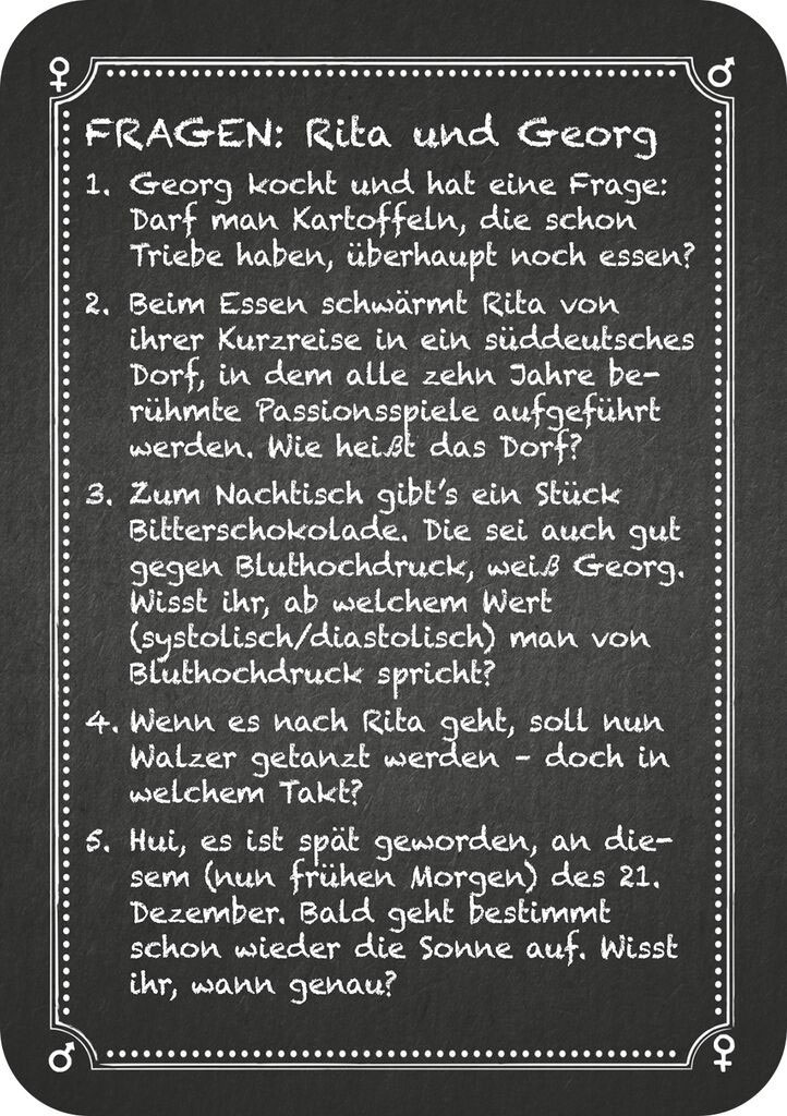 Egal, wie viele Spieler mitspielen: Insgesamt 250 brandneue lustige und spannende Fragen wartend darauf, im Team beantwortet zu werden. Bei diesem Set dreht sich alles um Freundschaft, Liebe, Partnerschaft, große Vorbilder und vieles mehr. Das dritte Ergänzungsset ist wie gewohnt mit den Spielen Kneipenquiz Das Original und Kneipenquiz Fußball-Spezial kombinierbar. Das Ergänzungsset ist aber auch ohne die beiden genannten Spiele spielbar.