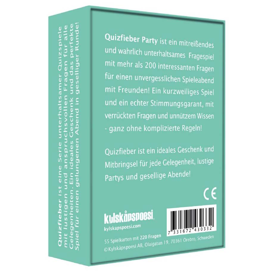 Quizfieber Party ist ein mitreißendes und wahrlich unterhaltsames Fragespiel mit mehr als 200 interessanten Fragen für einen unvergesslichen Spieleabend mit Freunden! Ein kurzweiliges Spiel und ein echter Stimmungsmacher, mit verrückten Fragen und unnützem Wissen ganz ohne komplizierte Regeln! Quizfieber ist ein ideales Geschenk und Mitbringsel für jede Gelegenheit, lustige Partys und gesellige Abende!