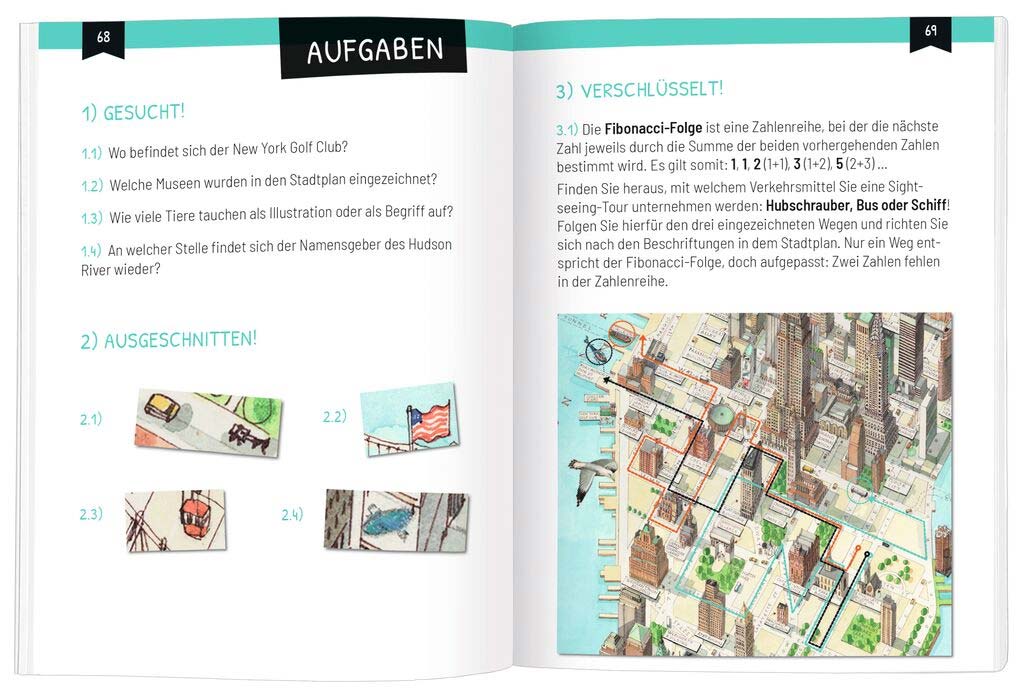 Welche Museen sind in den Stadtplan von New York eingezeichnet? Wie viele Tiere tauchen als Illustration oder als Begriff auf? Und wo befindet sich der New York Golf Club? All diese und ähnliche Fragen finden sich in der toll gestalteten Rätselmischung. Mit einem Auge fürs Detail können Rätselfans die gesuchten Objekte, Gebäude oder Personen finden und dabei so Einiges entdecken. Ein schöner Nebeneffekt: Die Karten bieten zudem unzählige wissenswerte Informationen rund um die abgebildeten Städte, Länder und Gewässer. Lernen und Rätseln gehen hier Hand in Hand! Diese Karten- und Rätselsammlung bietet eine perfekte Beschäftigung für einen gemütlichen Abend auf der Couch oder am verregneten Wochenende und ist ein tolles Geschenk für alle, die gerne suchen, knobeln und ihr Köpfchen gebrauchen. Noch dazu macht sich die Box dank ihres coolen Designs hervorragend als Hingucker im Regal.
