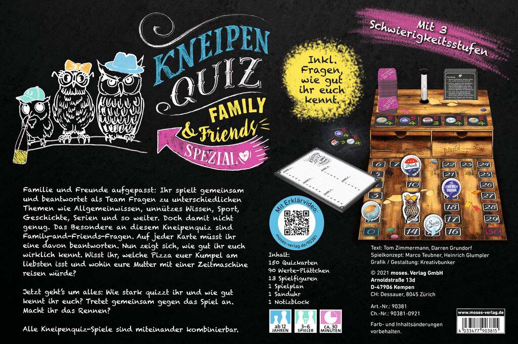 Das Kultspiel Kneipenquiz jetzt auch als Sonderedition mit Fragen über die Liebsten: Wer kennt die Lieblingspizza des besten Freundes und wer weiß, wohin Mama mit einer Zeitmaschine reisen würde? In der Family & Friends Spezial-Edition des erfolgreichen Brettspiels ist mehr als Allgemeinwissen rund um Kunst, Geschichte und Sport nötig. In besonderen Family-and-Friends-Fragen dreht sich alles um die Eigenheiten und Vorlieben von Familienmitgliedern und dem Freundeskreis. Wie gut kennen sich die Spieler*innen untereinander?