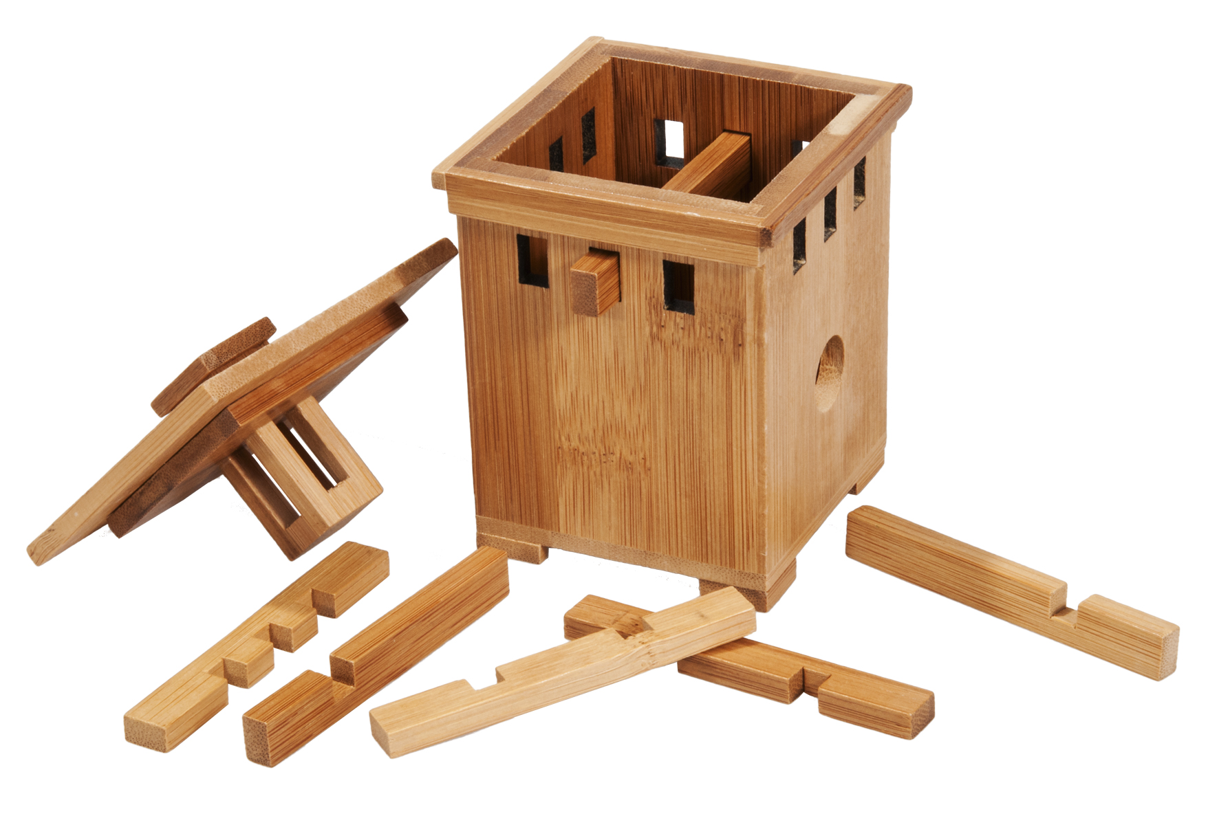 Aufgabe ist es, den Bambus-Safe zu öffnen und wieder zu schließen. Knifflige Knobelaufgabe, die außerdem noch ein schönes Dekostück mit Aufbewahrungsmöglichkeit ist.
