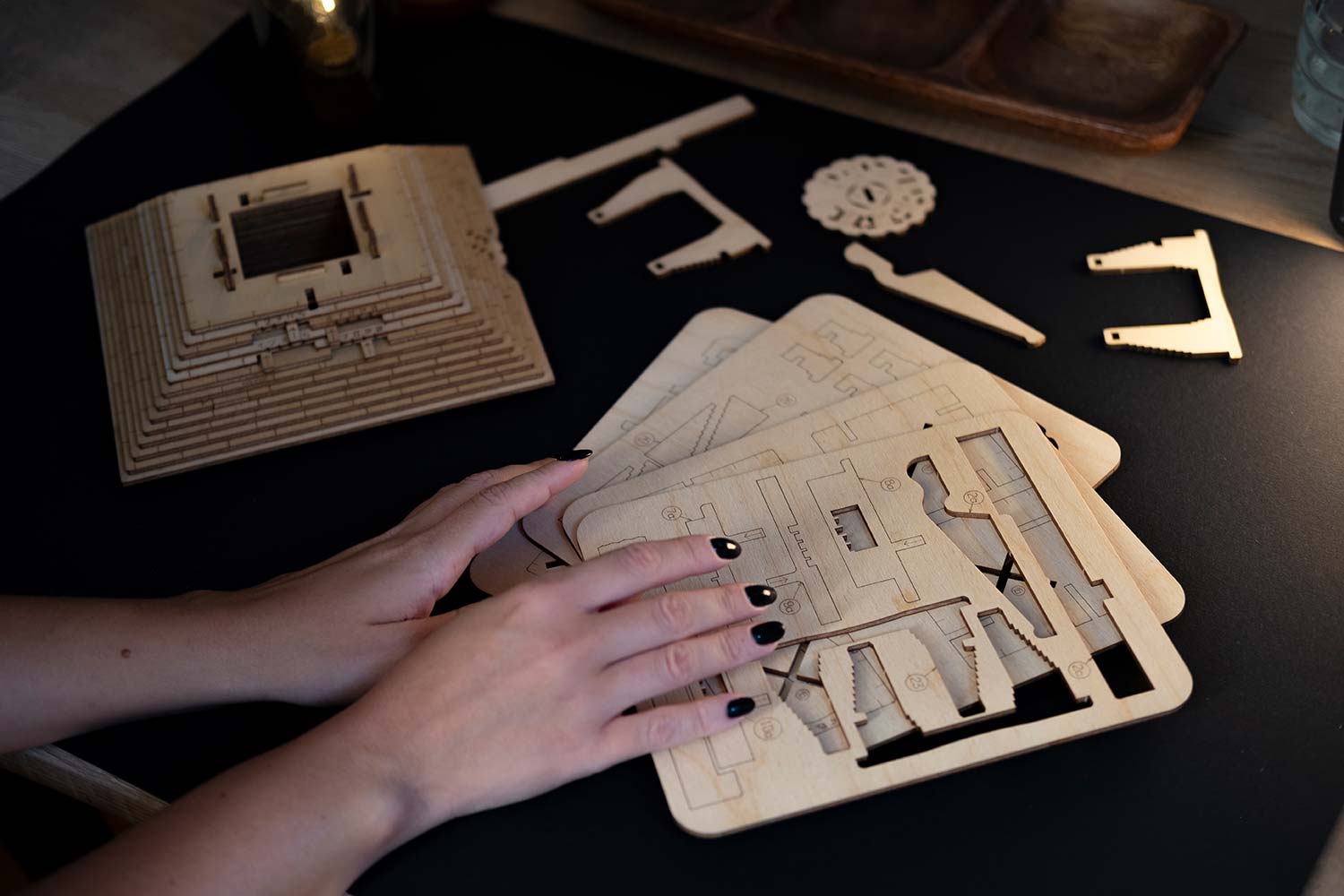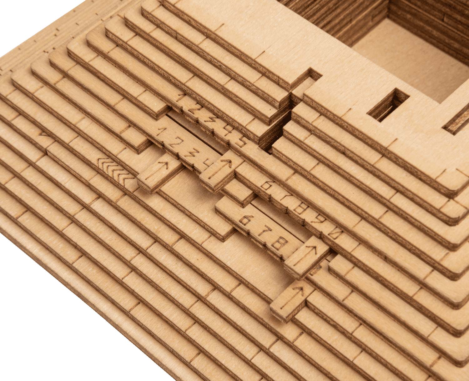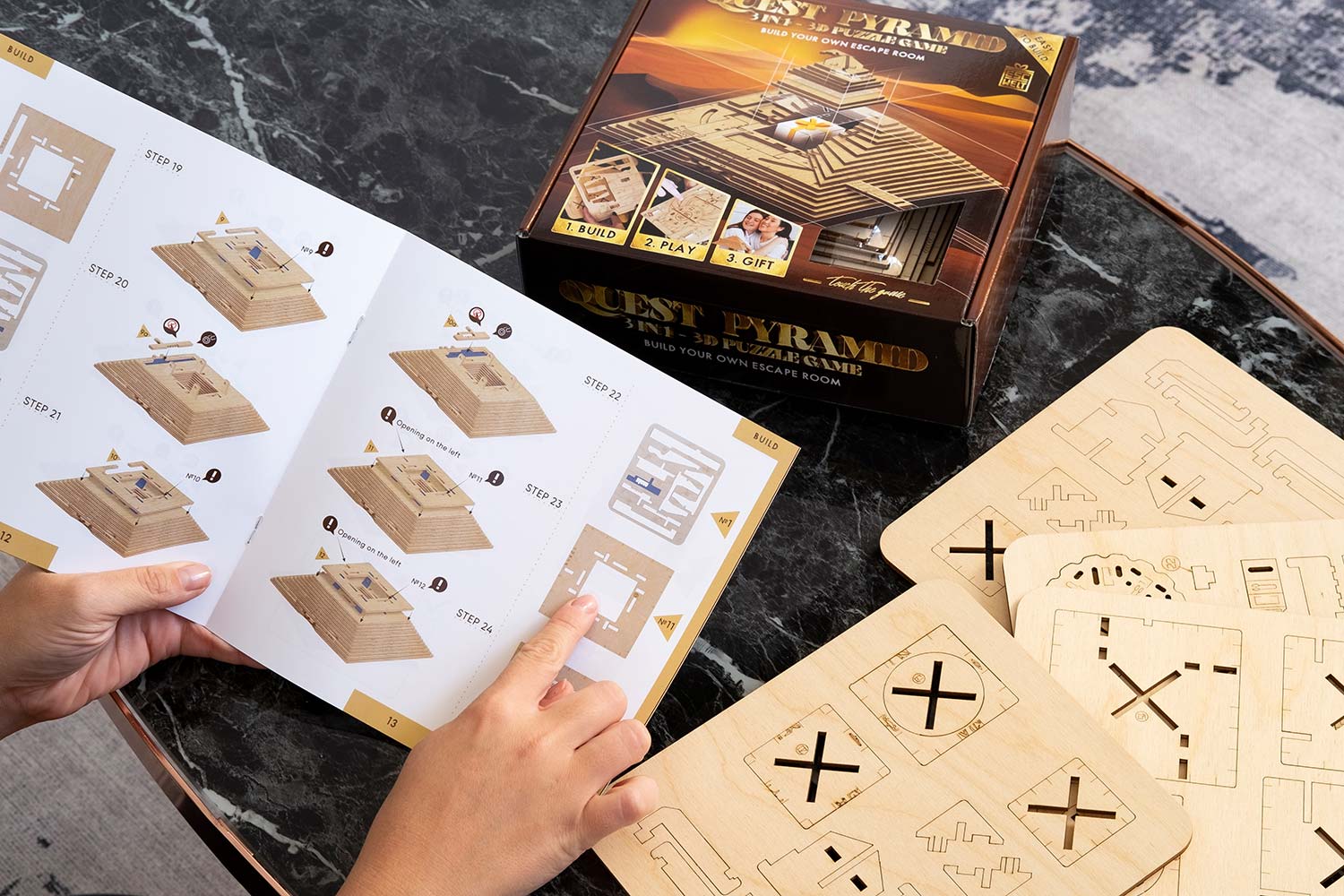 Die Quest Pyramide als Bausatz! Haben Sie doppelt Spaß, indem Sie zuerst die Box zusammenbauen und anschließend die Rätsel zum Öffnen der Box lösen! Der Bausatz besteht aus 70 Holzteilen, die in mehreren Holzplatten vorgelasert wurden.