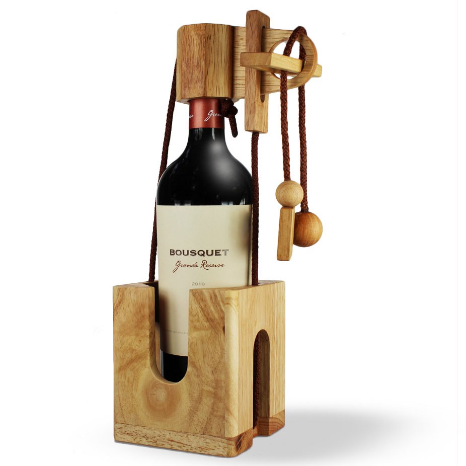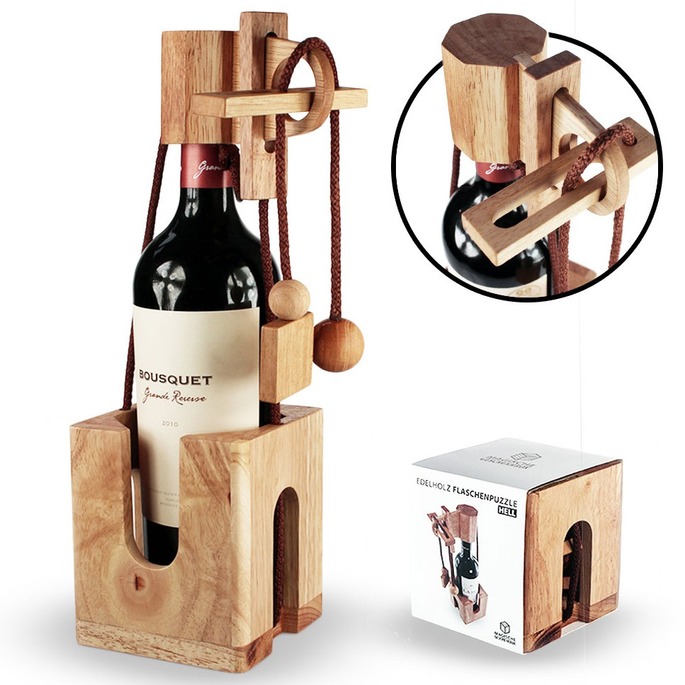 Das originale Edelholz Flaschenpuzzle (hell) ist ein tolles Geschenk für Weinliebhaber und alle, die sich gerne der Herausforderung eines kniffligen Knobelspiels stellen wollen.