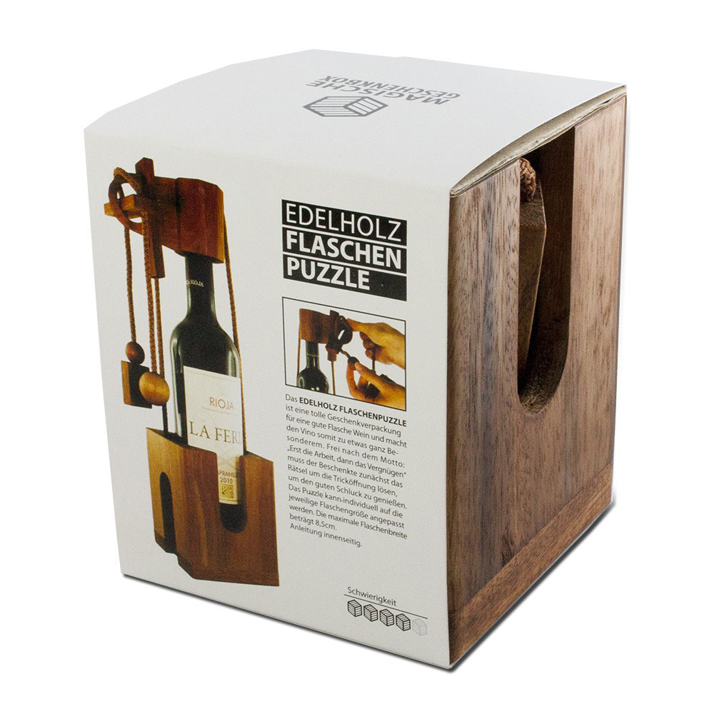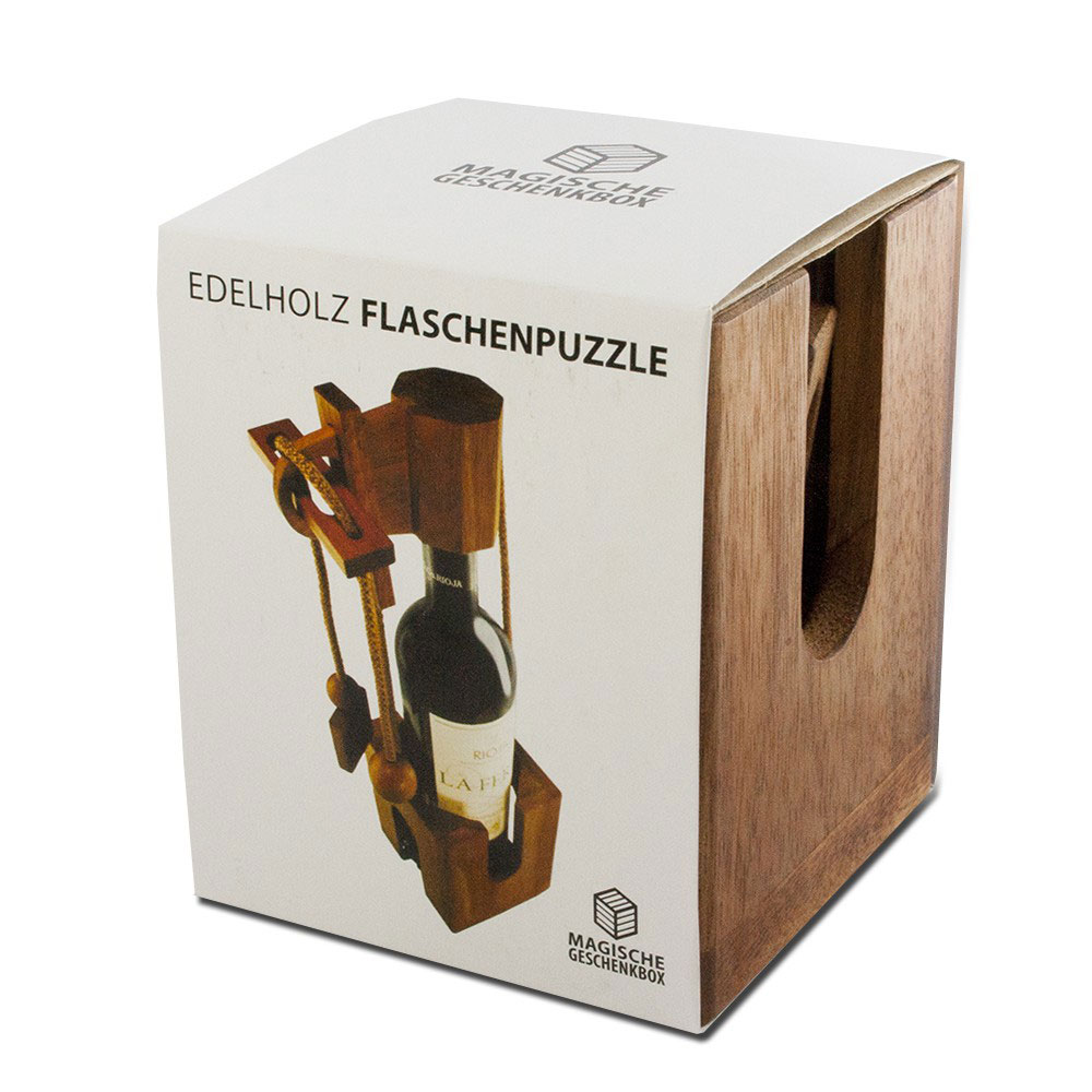 Das originale Edelholz Flaschenpuzzle (dunkel) ist ein tolles Geschenk für Weinliebhaber und alle, die sich gerne der Herausforderung eines kniffligen Knobelspiels stellen wollen.