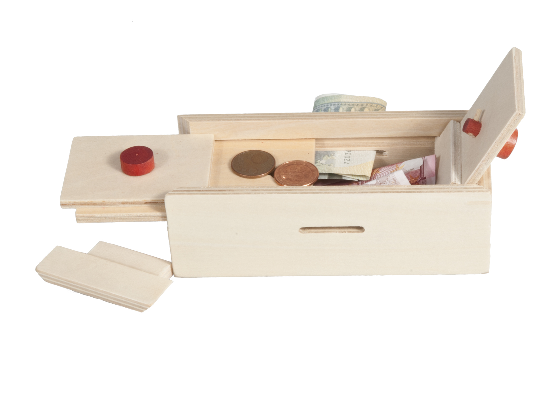 Sie suchen eine originelle Art, Geld zu verschenken? Hier ist sie. Die Geldgeschenkbox in natur/rot mit Knöpfen kann auch als kleiner Safe oder Geduldsspiel benutzt werden.