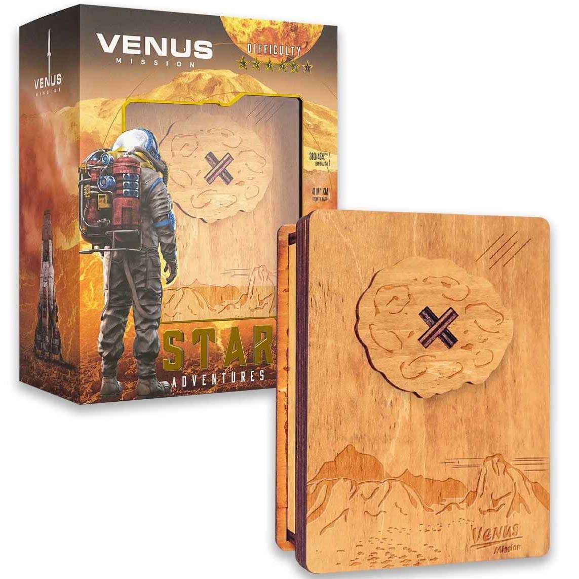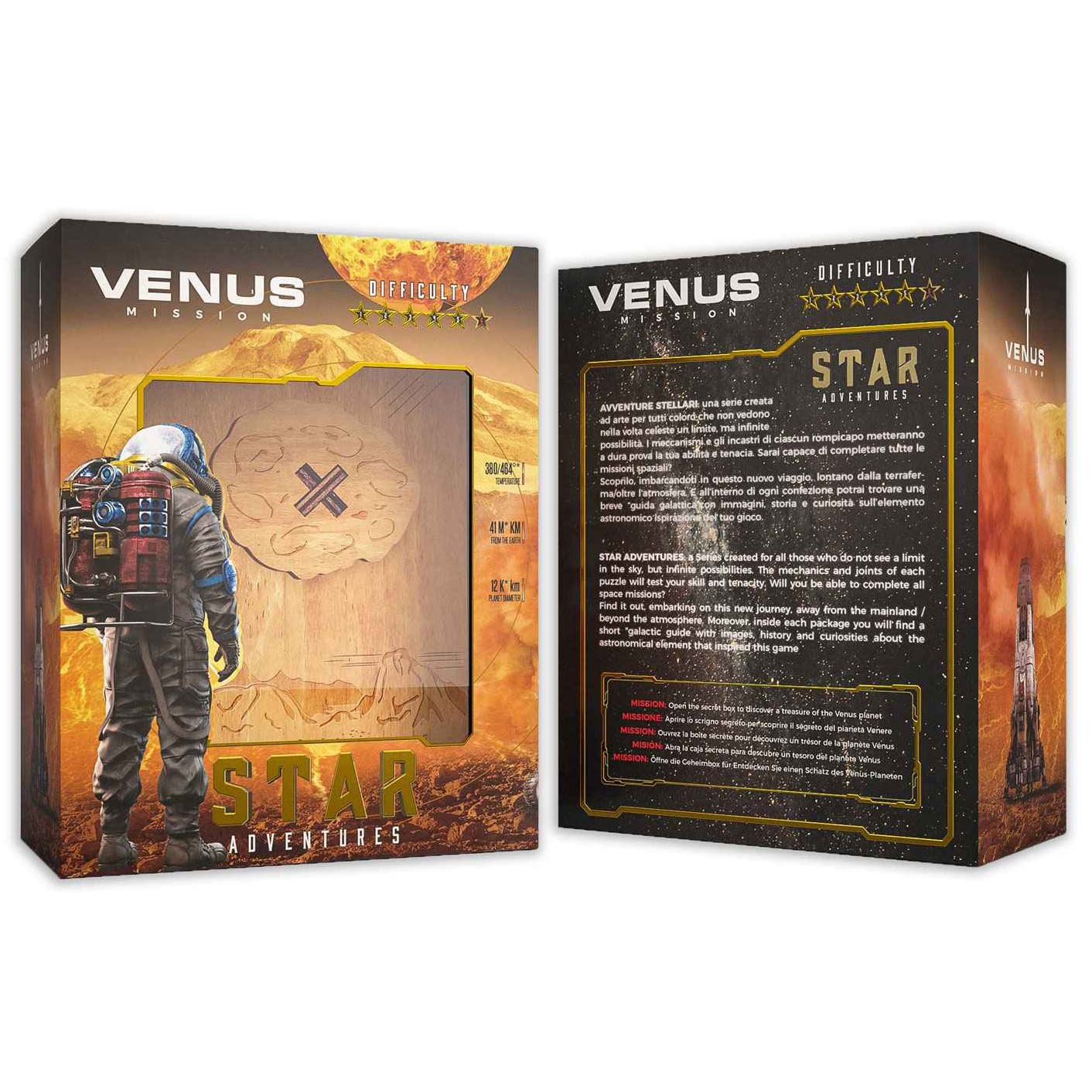 Die Trickbox Venus ist eine Trickkiste, die mit aufeinanderfolgenden Bewegungen geöffnet wird. Aufgabe: Entdecken Sie das Geheimnis des Planeten Venus: Öffnen Sie die geheime Truhe und finden Sie das darin verborgene Geheimnis. In jeder Box finden Sie das Puzzle und eine Broschüre mit Informationen über das Weltraumobjekt: Bilder, Geschichte und wichtige Fakten.