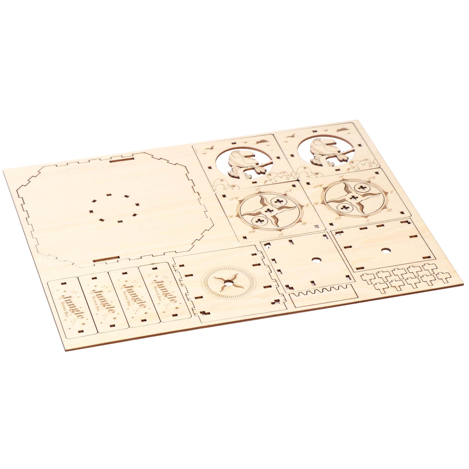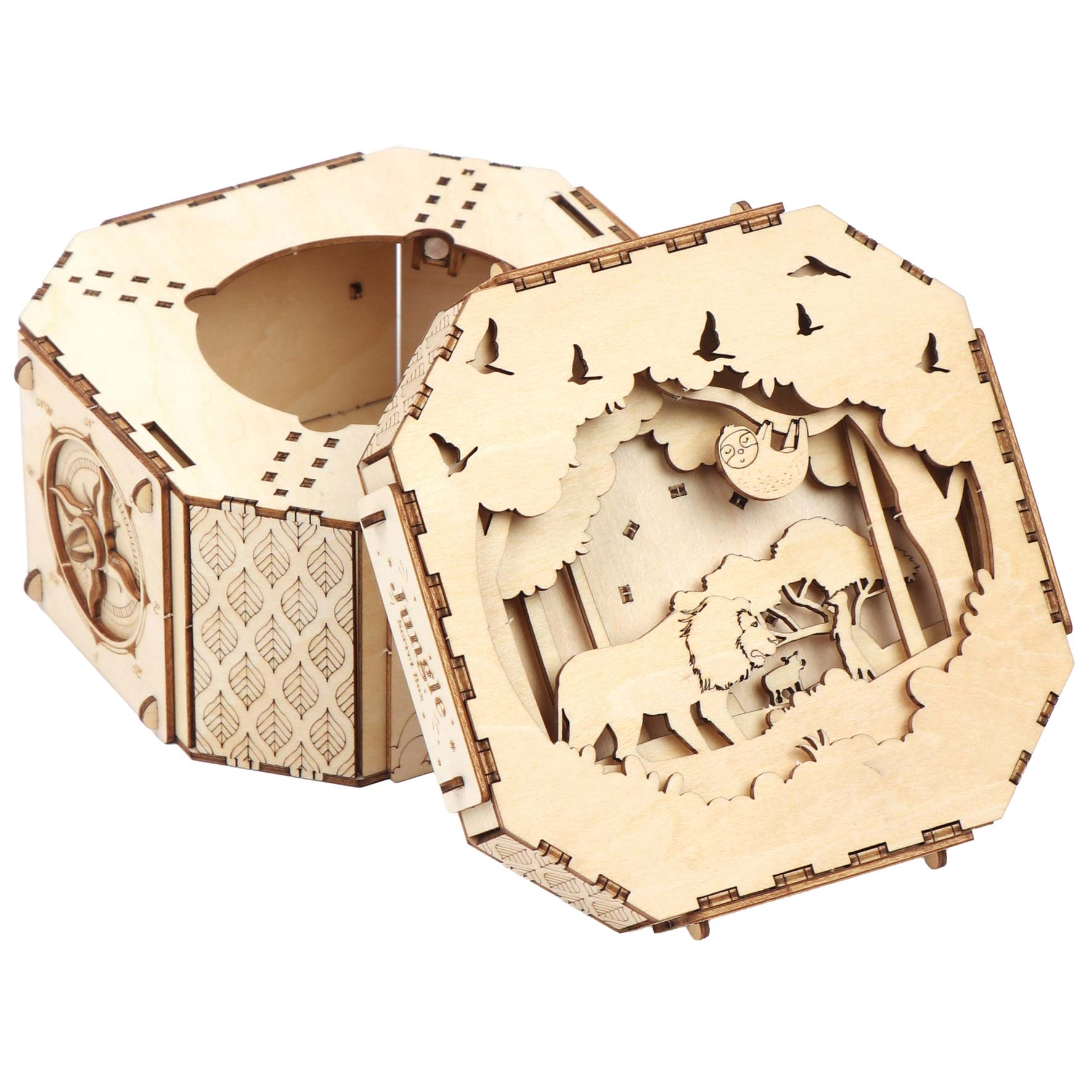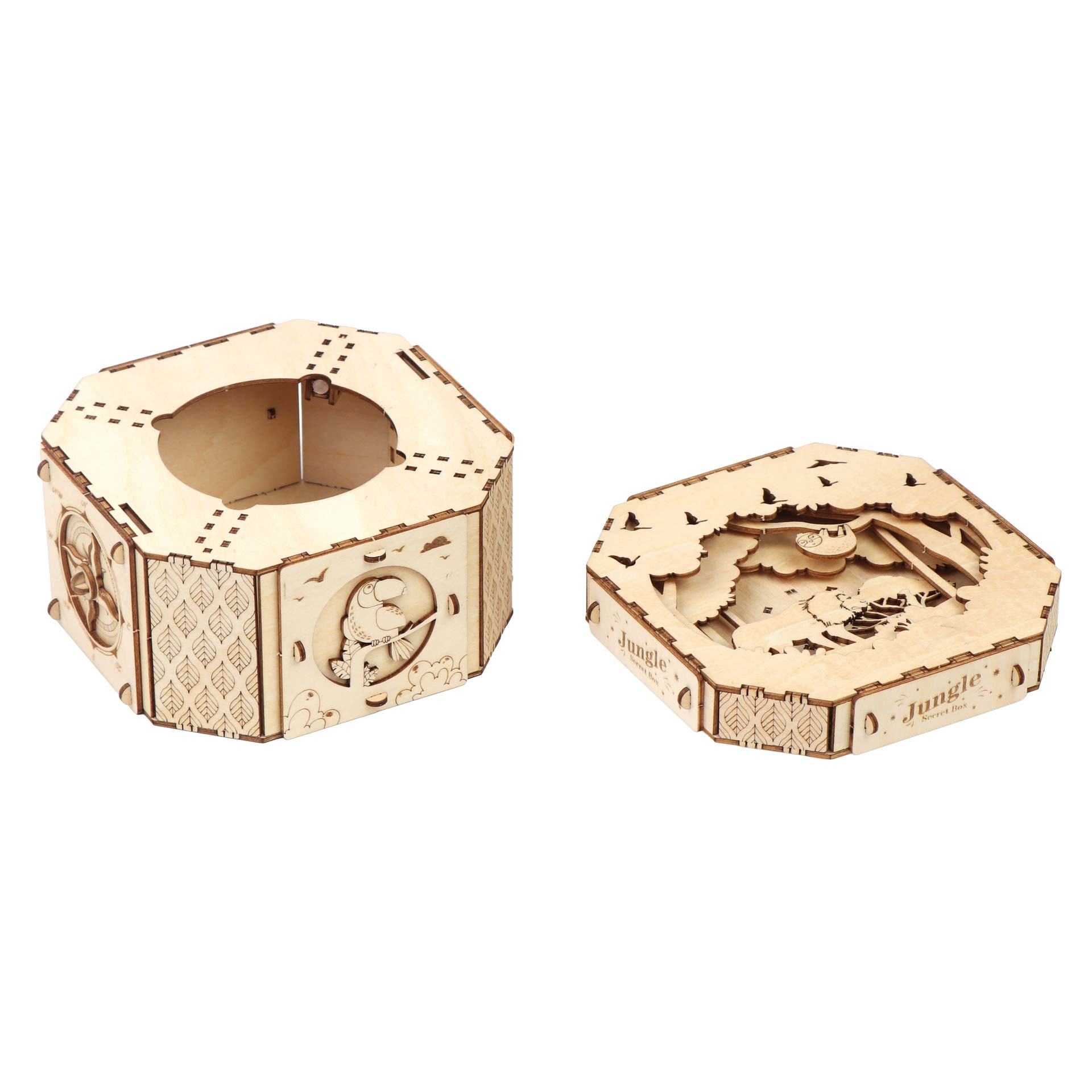 Nach dem Zusammenbau dieses aus lasergeschnittenen Präzisions-Holzteilen bestehenden Kistchens erhält man einen wunderbaren Aufbewahrungsort für kleine Geheimnisse, der durch einen auf dem physikalischen Prinzip der Zentrifugalkraft basierenden Geheimverschluss geschützt ist.