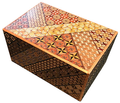 Die japanische Trickbox Himitsu Bako 4.2 Sun 21 Steps Natural Wood. Himitsu Bako ist Japanisch und steht für "Geheimkasten". Die Box wird aus Holz in Handarbeit hergestellt und kann nur geöffnet werden, indem einzelne Elemente der Box in einer bestimmten Reihenfolge verschoben werden.Eine Lösung zum Öffnen der Box liegt bei.In der Regel wird für eine Himitsu Bako die Anzahl der Schritte, die zum Öffnen nötig sind, angegeben (Steps) sowie die Größe der Box (z.B. Sun). Ein Sun entspricht dabei 3,03 cm. Außerdem wird die Technik, wie die Box verziert wird, angegeben. Die Verzierungskunst Yosegi ist eine über 200 Jahre alte Handwerkskunst. Verschiedenfarbige Hölzer kommen zum Einsatz, um die Formen und Muster abzubilden. Es gibt nur sehr wenige Meister, die in der Lage sind, Yosegi herzustellen. Diese Verzierungen werden in der Regel nicht von den Himitsu Bako Meistern hergestellt, sondern eingekauft und auf den Boxen aufgebracht.Bitte beachten Sie, dass die Boxen echte Handarbeit sind. Jede Box mit ihrer Verzierung ist einmalig, weshalb sich das genaue Muster von dem auf den Bildern unterscheiden kann.