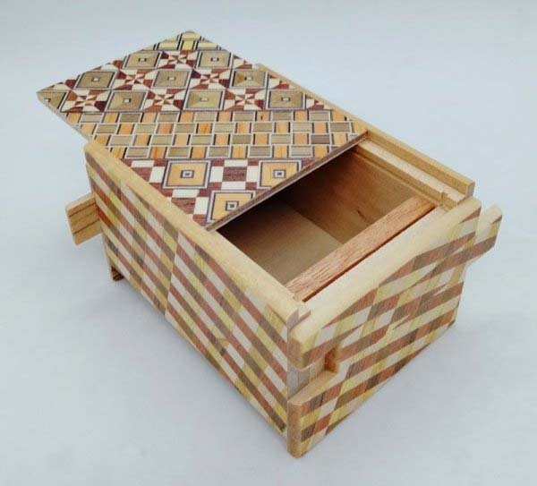 Die japanische Trickbox Himitsu Bako 3 Sun 12 Steps Yosegi / Ichimatsu: Himitsu Bako ist Japanisch und steht für "Geheimkasten". Die Box wird aus Holz in Handarbeit hergestellt und kann nur geöffnet werden, indem einzelne Elemente der Box in einer bestimmten Reihenfolge verschoben werden.