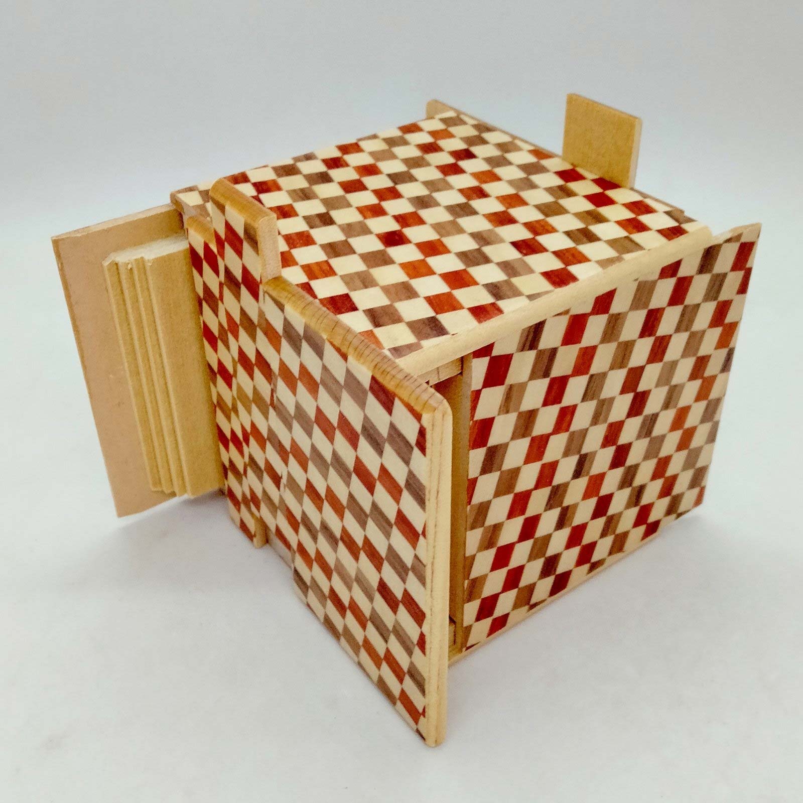 Die japanische Trickbox Himitsu Bako 3 Sun Cube 27 Steps Ichimatsu. Himitsu Bako ist Japanisch und steht für "Geheimkasten". Die Box wird aus Holz in Handarbeit hergestellt und kann nur geöffnet werden, indem einzelne Elemente der Box in einer bestimmten Reihenfolge verschoben werden.