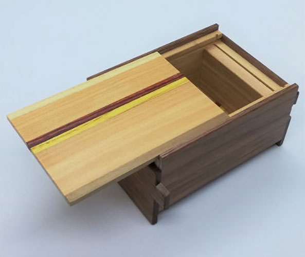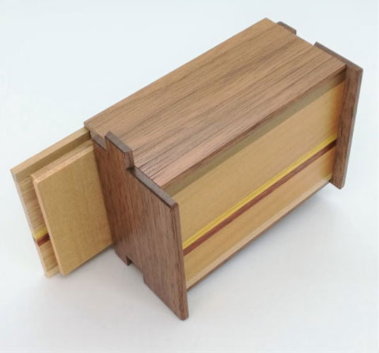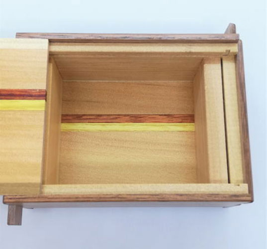 Die japanische Trickbox Himitsu Bako 4 Sun 12 Steps Natural Wood in limitierter Stückzahl. Himitsu Bako ist Japanisch und steht für "Geheimkasten". Die Box wird aus Holz in Handarbeit hergestellt und kann nur geöffnet werden, indem einzelne Elemente der Box in einer bestimmten Reihenfolge verschoben werden.
