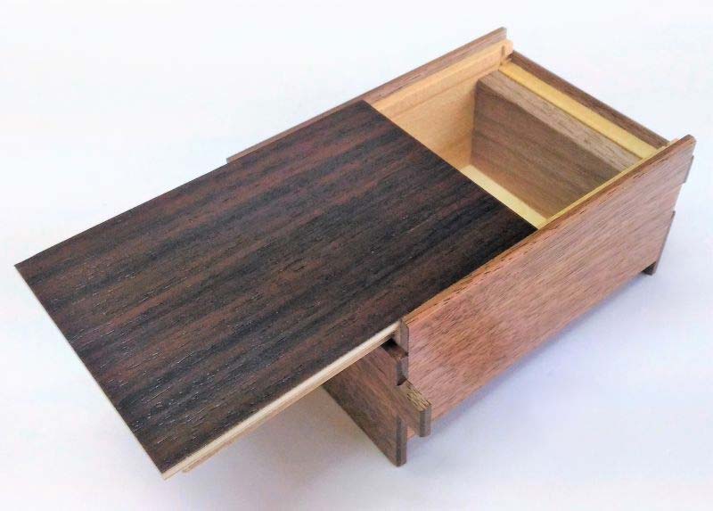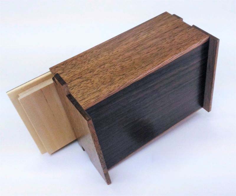 Die japanische Trickbox Himitsu Bako 4 Sun 14 Steps Natural / Rosewood. Himitsu Bako ist Japanisch und steht für "Geheimkasten". Die Box wird aus Holz in Handarbeit hergestellt und kann nur geöffnet werden, indem einzelne Elemente der Box in einer bestimmten Reihenfolge verschoben werden.